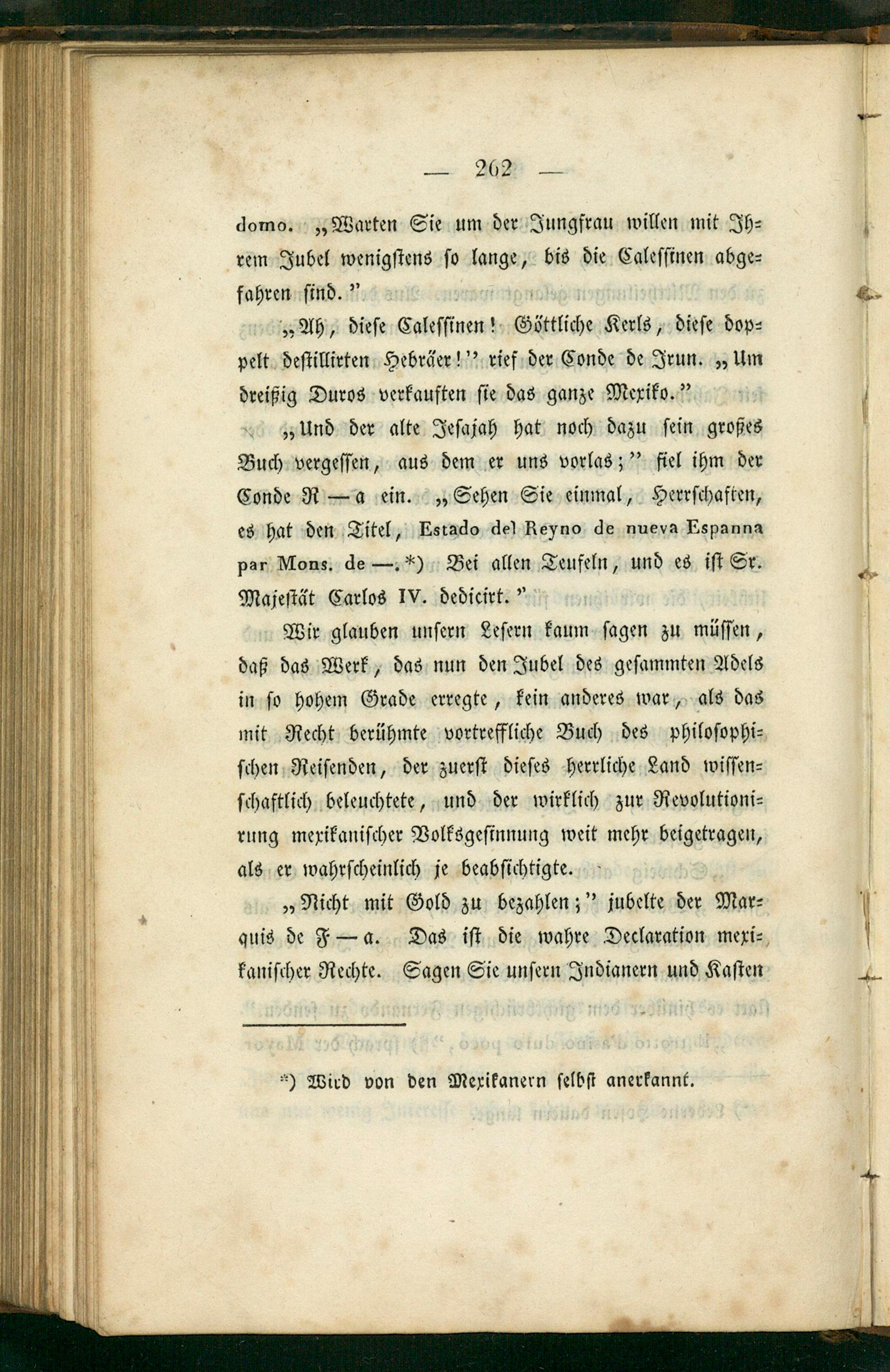 „Und der alte Jeſajah hat noch dazu ſein großes Buch vergeſſen, aus dem er uns vorlas;“ fiel ihm der Conde R— a ein.„Sehen Sie einmal, Herrſchaften, es hat den Titel, Estado del Reyno de nueva Espanna par Mons. de—.*) Bei allen Teufeln, und es iſt Sr. Majeſtät Carlos IV. dedicirt.”