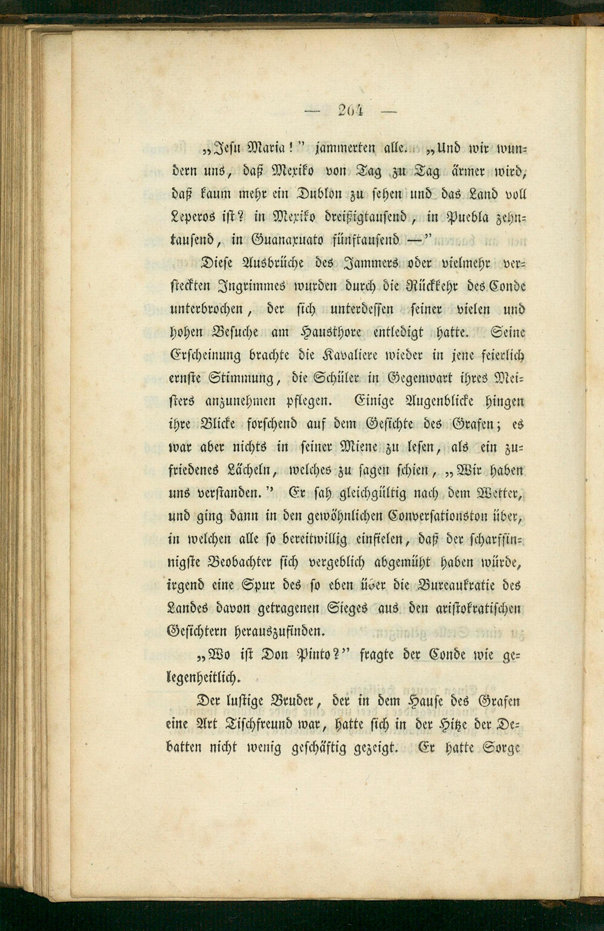Dieſe Ausbrüche des Jammers oder vielmehr ver⸗ ſteckten Ingrimmes wurden durch die Rückkehr des Conde unterbrochen, der ſich unterdeſſen ſeiner vielen und hohen Beſuche am Hausthore entledigt hatte. Seine Erſcheinung brachte die Kavaliere wieder in jene feierlich ernſte Stimmung, die Schüler in Gegenwart ihres Mei⸗ ſters anzunehmen pflegen. Einige Augenblicke hingen ihre Blicke forſchend auf dem Geſichte des Grafen; es war aber nichts in ſeiner Miene zu leſen, als ein zu⸗ friedenes Lächeln, welches zu ſagen ſchien,„Wir haben uns verſtanden.“ Er ſah gleichgültig nach dem Wetter, und ging dann in den gewöhnlichen Converſationston über, in welchen alle ſo bereitwillig einfielen, daß der ſcharffin⸗ nigſte Beobachter ſich vergeblich abgemüht haben würde, irgend eine Spur des ſo eben üser die Bureaukratie des Landes davon getragenen Sieges aus den ariſtokratiſchen Geſichtern herauszufinden.