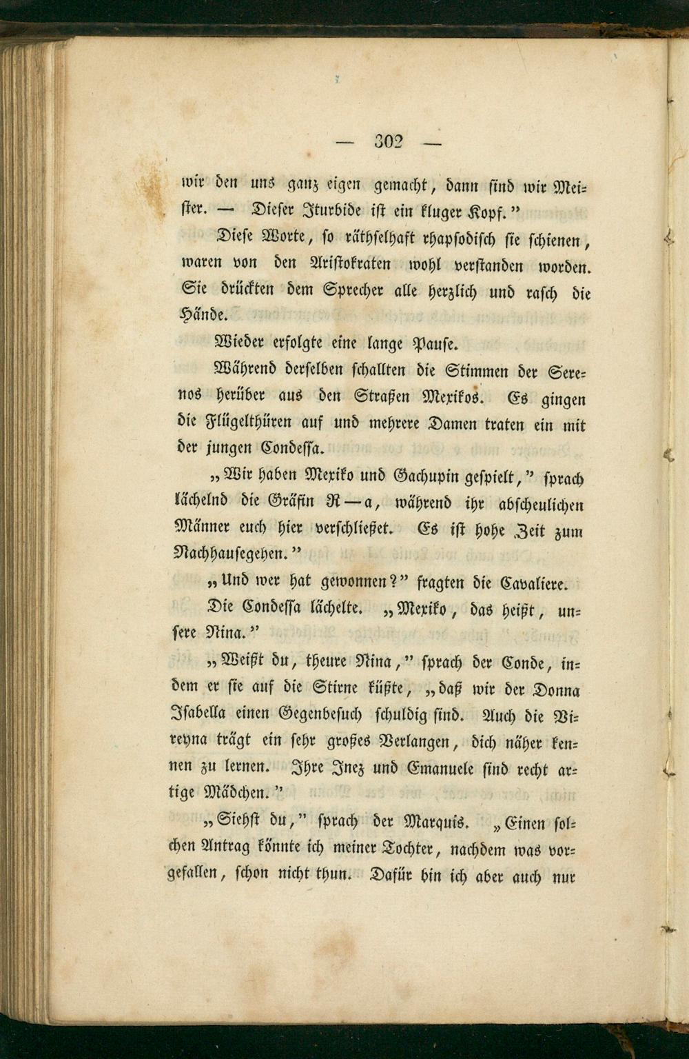 „Wir haben Mexiko und Gachupin geſpielt,“ ſprach lächelnd die Gräfin R— a, während ihr abſcheulichen Männer euch hier verſchließet. Es iſt hohe Zeit zum Nachhauſegehen.”