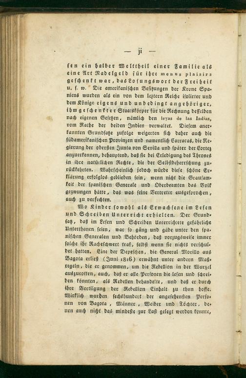 Wo Kinder ſowohl als Erwachſene im Leſen und Schreiben Unterricht erhielten. Der Grund⸗ ſah, daß im Leſen und Schreiben unterrichtete gefährliche Unterthanen ſeien, war ſo gäng und gäbe unter den ſpa⸗ niſchen Generalen und Behörden, daß vorzugsweiſe immer ſolche ihr Racheſchwert traf, ſelbſt wenn ſie nichts verſchul⸗ det hatten. Eine der Depeſchen, die General Morillo aus Bagota erließ(Juni 1816) erwähnt unter andern Maß⸗ regeln, die er genommen, um die Rebellion in der Wurzel auszurotten, auch, daß er alle Perſonen die leſen und ſchrei⸗ ben könnten, als Rebellen behandelte, und daß er durch ihre Vertilgung der Rebellion Einhalt zu thun hoffe. Wirklich wurden ſechshundert der angeſehenſten Perſo⸗ nen von Bagota, Männer, Weiber und Töchter, de⸗ nen auch nicht das mindeſte zur Laſt gelegt werden konnte,