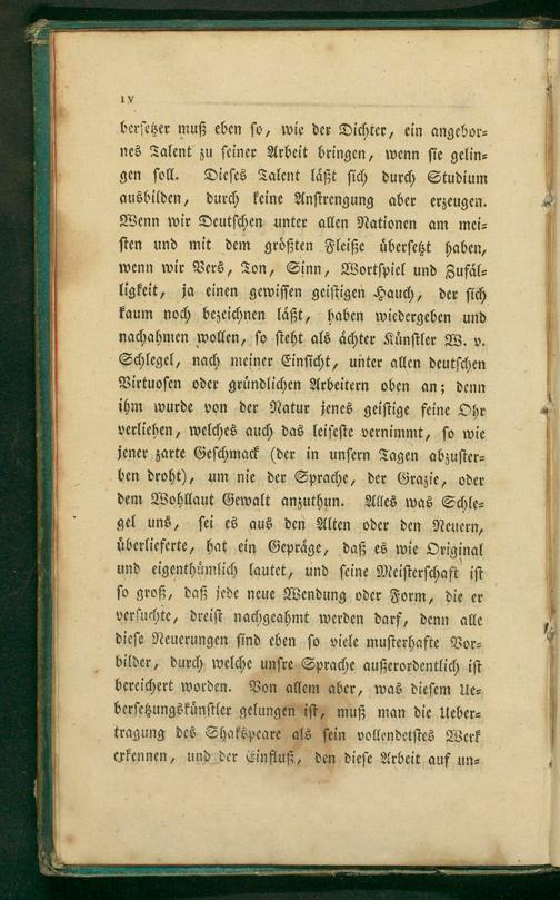 kaum noch bezeichnen läßt, haben wiedergeben und nachahmen wollen, ſo ſteht als aͤchter Kuͤnſtler W. v. Schlegel, nach meiner Einſicht, unter allen deutſchen Virtuoſen oder gruͤndlichen Arbeitern oben an; denn ihm wurde von der Natur jenes geiſtige feine Ohr verliehen, welches auch das leiſeſte vernimmt, ſo wie jener zarte Geſchmack(der in unſern Tagen abzuſter⸗ ben droht), um nie der Sprache, der Grazie, oder dem Wohllaut Gewalt anzuthun. Alles was Schle⸗ gel uns, ſei es aus den Alten oder den Neuern, uberlieferte, hat ein Geprage, daß es wie Original und eigenthuͤmlich lautet, und ſeine Meiſterſchaft iſt ſo groß, daß jede neue Wendung oder Form, die er verſuchte, dreiſt nachgeahmt werden darf, denn alle dieſe Neuerungen ſind eben ſo viele muſterhafte Vor⸗ bilder, durch welche unſre Sprache außerordentlich iſt bereichert worden. Von allem aber, was dieſem Ue⸗ berſetzungskuͤnſtler gelungen iſt, muß man die Ueber⸗ tragung des Shakspeare als ſein vollendetſtes Werk erkennen, und der Sinſß den dieſe Arbeit auf un⸗