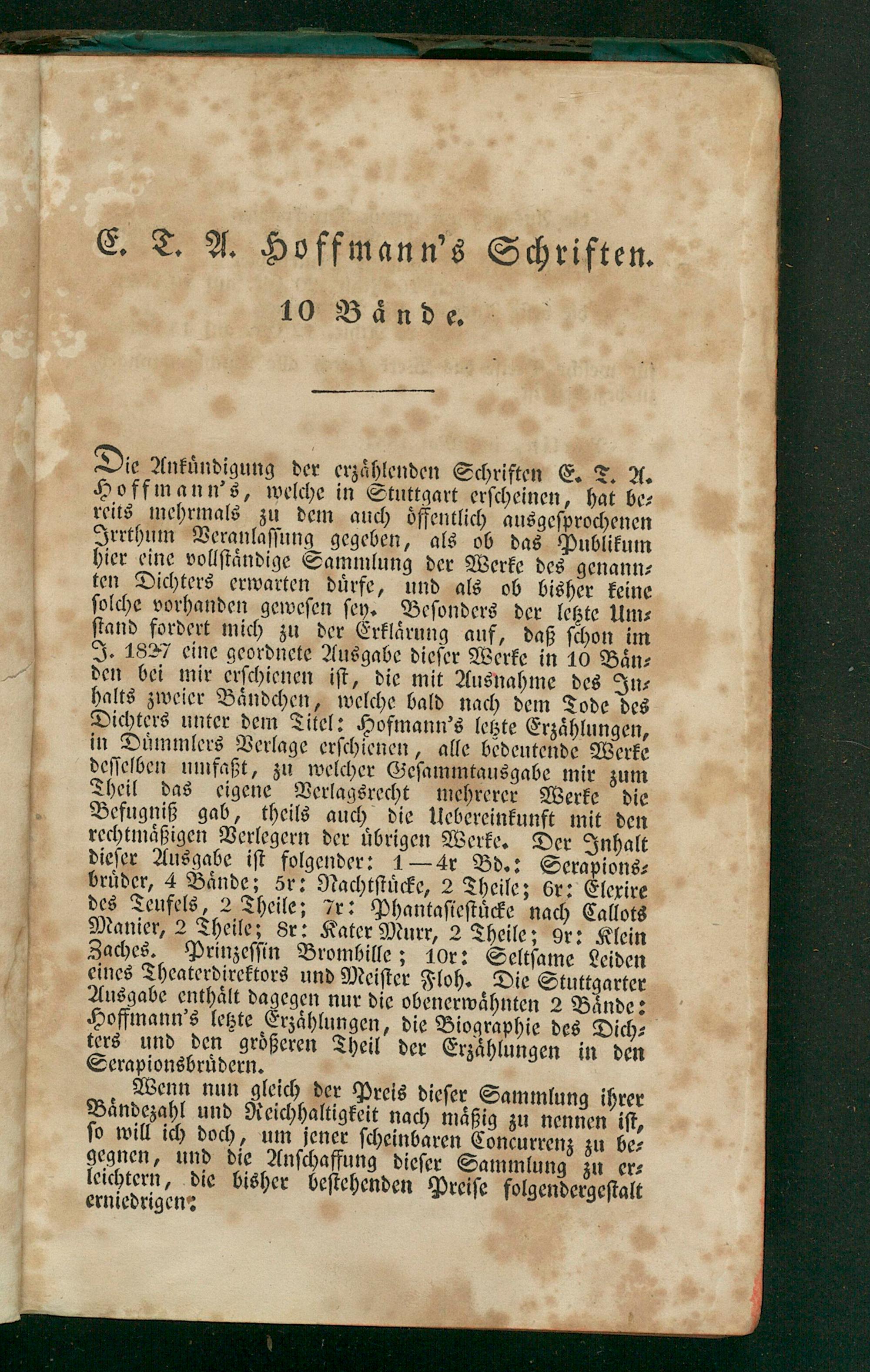 De Ankuͤndigung der erzaͤhlenden Schriften E. T. A. Hoffmann's, welche in Stuttgart erſcheinen, hat be⸗ reits mehrmals zu dem auch oͤffentlich ausgeſprochenen Irrthum Veranlaſſung gegeben, als ob das Publikum hier eine vollſtaͤndige Sammlung der Werke des genann⸗ ten Dichters erwarten duͤrfe, und als ob bisher keine ſolche vorhanden geweſen ſey. Beſonders der letzte Um⸗ ſtand fordert mich zu der Erklaͤrung auf, daß ſchon im J. 1827 eine geordnete Ausgabe dieſer Werke in 10 Baͤn⸗ den bei mir erſchienen iſt, die mit Ausnahme des In⸗ halts zweier Baͤndchen, welche bald nach dem Tode des Dichters unter dem Titel: Hofmann's letzte Erzaͤhlungen, in Duͤmmlers Verlage erſchienen, alle bedentende Werke deſſelben umfaßt, zu welcher Geſammtausgabe mir zum Theil das eigene Verlagsrecht mehrerer Werke die Befugniß gab, theils auch die Uebereinkunft mit den rechtmaͤßigen Verlegern der uͤbrigen Werke. Der Inhalt dieſer Ausgabe iſt folgender: 1— 4r Bd.: Serapions⸗ bruͤder, 4 Baͤnde; 5r: Nachtſtuͤcke, 2 Theile; 6r: Elexire des Teufels, 2 Theile; Ir: Phantaſieſtuͤcke nach Callots Manier, 2 Theile; 8r: Kater Murr, 2 Theile; 9r: Klein Zaches. Prinzeſſin Brombille; 10r: Seltſame Leiden eines Theaterdirektors und Meiſter Floh. Die Stuttgarter Ausgabe enthaͤlt dagegen nur die obenerwaͤhnten 2 Bände: Hoffmann's letzte Erzaͤhlungen, die Biographie des Dich⸗ ters und den groͤßeren Theil der Erzahlungen in den Serapionsbruͤdern.