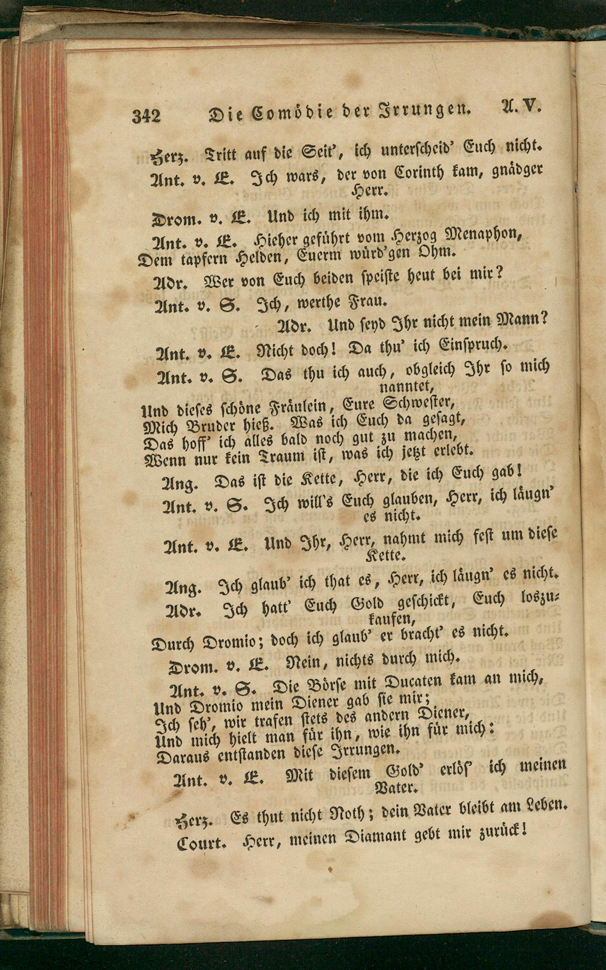 Ant. v. S. Die Boͤrſe mit Ducaten kam an mich⸗ Und Dromio mein Diener gab ſie mirz Ich ſeh', wir trafen ſtets des andern Diener, ſind mich hielt man fuͤr ihn, wie ihn fuͤr mich: Daraus entſtanden dieſe Irrungen.