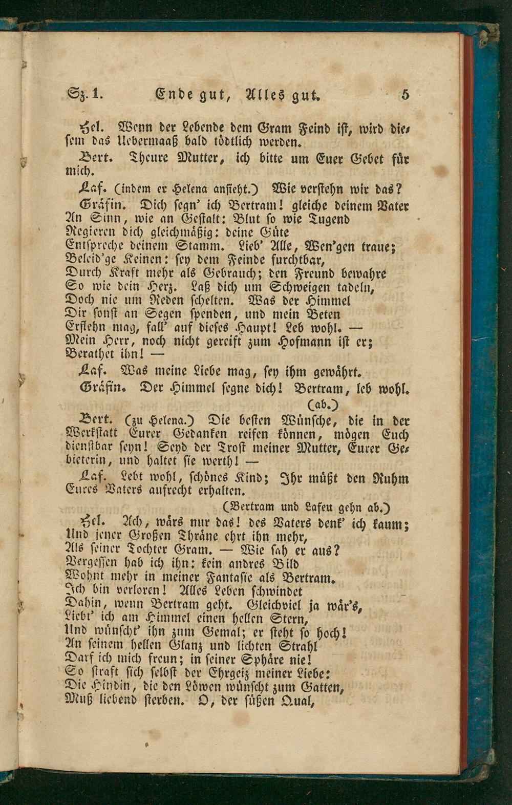 Laf.(indem er Helena anſieht.) Wie verſtehn wir das? Gräfin. Dich ſegn' ich Bertram! gleiche deinem Vater An Sinn, wie an Geſtalt: Blut ſo wie Tugend