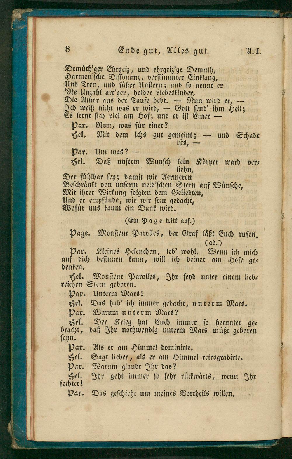 (ab.) ar. Kleines Helenchen, leb' wohl. Wenn ich mich auf dich beſinnen kann, will ich deiner am Hofe ge⸗ denken. Zel. Monſieur Parolles, Ihr ſeyd unter einem lieb⸗ reichen Stern geboren. Par. Unterm Mars! Zel. Das hab' ich immer gedacht, unterm Mars. Par. Warum unterm Mars?