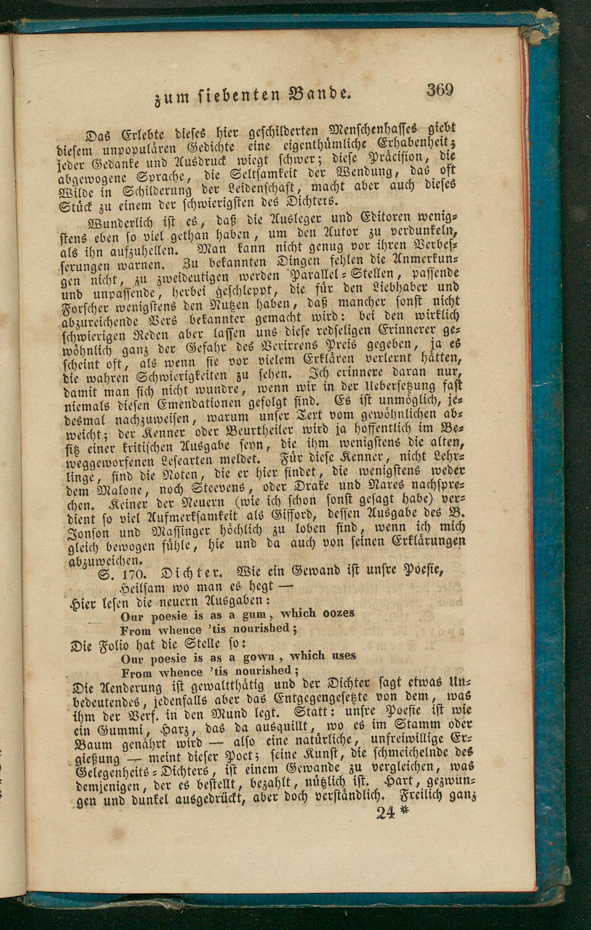 Wunderlich iſt es, daß die Ausleger und Editoren wenig⸗ ſtens eben ſo viel gethan haben, um den Autor zu verdunkeln, als ihn aufzuhellen. Man kann nicht genug vor ihren Verbeſ⸗ ſerungen warnen. Zu bekannten Dingen fehlen die Anmerkun⸗ gen nicht, zu zweideutigen werden Parallel-Stellen, paſſende und unpaſſende, herbei geſchleppt, die fuͤr den Liebhaber und Forſcher wenigſtens den Nutzen haben, daß mancher ſonſt nicht abzureichende Vers bekannter gemacht wird: bei den wirklich ſchwierigen Reden aber laſſen uns dieſe redſeligen Erinnerer ge⸗ wohnlich ganz der Gefahr des Verirrens Preis gegeben, ja es ſcheint oft, als wenn ſie vor vielem Erklären verlernt haͤtten, die wahren Schwierigkeiten zu ſehen. Ich erinnere daran nur, damit man ſich nicht wundre, wenn wir in der Ueberſetzung faſt niemals dieſen Emendationen gefolgt ſind. Es iſt unmoͤglich, je⸗ desmal nachzuweiſen, warum unſer Tert vom gewoͤhnlichen ab⸗ weicht; der Kenner oder Beurtheiler wird ja hoffentlich im Be⸗ ſitz einer kritiſchen Ausgabe ſeyn, die ihm wenigſtens die alten, weggeworfenen Leſearten meldet. Fuͤr dieſe Kenner, nicht Lehr⸗ linge, ſind die Noten, die er hier findet, die wenigſtens weder dem Malone, noch Steevens, oder Drake und Nares nachſpre⸗ chen. Keiner der Neuern(wie ich ſchon ſonſt geſagt habe) ver⸗ dient ſo viel Aufmerkſamkeit als Gifford, deſſen Ausgabe des B. Jonſon und Maſſinger hoͤchlich zu loben ſind, wenn ich mich gleich bewogen fuͤhle, hie und da auch von ſeinen Erklaͤrungen abzuweichen.