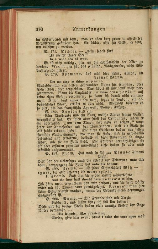 veranſtaltet hat. Er ſpielt aber ſelbſt den Erſtaunten, indem er P uͤberraſcht.„Um dem Timon ihre Liebe zu zeigen,“ tanzt eder der Anweſenden mit den Taͤnzerinnen, weil die Gaͤſte ſie als ſolche erkannt haben. Die alten Editionen haben nur ſelten ſceniſche Nachweiſungen, wo man ſie findet ſind ſie gewoͤhnlich bedeutend und erklärend, deshalb iſt dieſe Andeutung ſo einge⸗ fuͤhrt, wie ſie im Folio ſteht. Die Editoren vernachlaͤſſigen ſie oft oder erfinden zuweilen unnöthige; dieſe haben ſie aber auch woͤrtlich aufgenommen.
