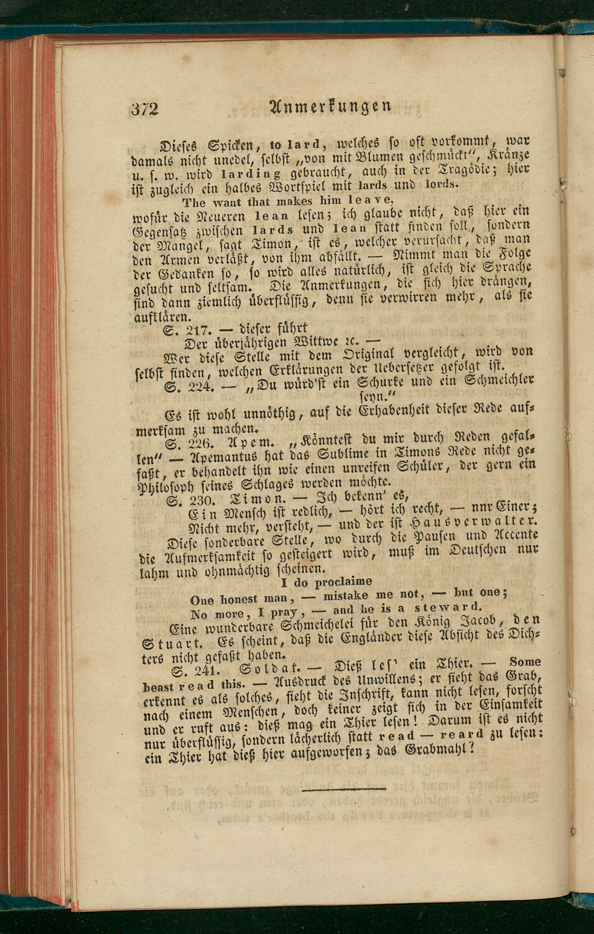 wofuͤr die Neueren lean leſenz ich glaube nicht, daß hier ein Gegenſatz zwiſchen lards und lean ſtatt finden ſoll, ſondern der Mangel, ſagt Timon, iſt es, welcher verurſacht, daß man den Armen verlaͤßt, von ihm abfaͤllt.— Nimmt man die Folge der Gedanken ſo, ſo wird alles natuͤrlich, iſt gleich die Sprache geſucht und ſeltſam. Die Anmerkungen, die ſich hier draͤngen, ſind dann ziemlich uͤberfluſſig, denn ſie verwirren mehr, als ſie auftlaͤren.