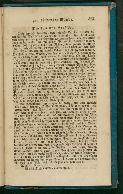 Dieſe heroiſche Comoͤdie, dieſe tragiſche Parodie iſt unter al⸗ len Werken Shakſpears gewiß das ſeltſamſte. Es ſcheint auch von jeher am wenigſten begriffen worden zu ſeyn, wie das Stuͤck denn auch, nach einer proſaiſchen Vorrede der Quart⸗Ausgabe, welche 1609 erſchien, nicht im Globus, dem großen Sommer⸗ theater, geſpielt wurde; ich vermuthe, daß es ſelbſt auf dem klei⸗ neren Wintertheater in Black Friars nicht iſt gegeben worden. Im Palaſte eines Großen, fuͤr den es wohl eigen gedichtet war, wurde es dargeſtellt; nach meiner Vermuthung fuͤr den Koͤnig ſelbſt, der, ſo ſchwach er war, ſo verächtlich er ſich zuweilen zei⸗ gen mochte, und ſo pedantiſch ſeine Weisheit und ſo kurzſichtig ſeine Politik erſchien, doch einen gewiſſen feineren Sinn fuͤr Poe⸗ ſie, Witz und Scharfſinn haben mußte, als die Geſchichtſchreiber ſeines Staatslebens ihm zugeſtehn wollen. Sey es alſo der Koͤ⸗ nig, oder ein Vornehmer, den wir nicht zu nennen wiſſen, genug, fur dieſen zunaͤchſt und nicht fuͤr das Publikum, dichtete Shak⸗ ſpear dieſes wunderſame Luſtſpiel. Hat er in den meiſten ſeiner Werke ſeine reiche, gewandte und gewaltſame Sprache dem Ge⸗ genſtande und den Gedanken untergeordnet, iſt im Unterbrochenen, Widerſpenſtigen, Widerſprechenden auch fuͤr den Kenner die Schoͤnheit ſeines Styles zu finden, ſo hat er hier Vers und Sprache, wie ſonſt nie wieder, recht eigentlich con amore bear⸗ beitet, er ſchwelgt im Witz und der Antitheſe, er fühlt ſich be⸗ haglich in ſeiner vollendeten Virtuoſitat.