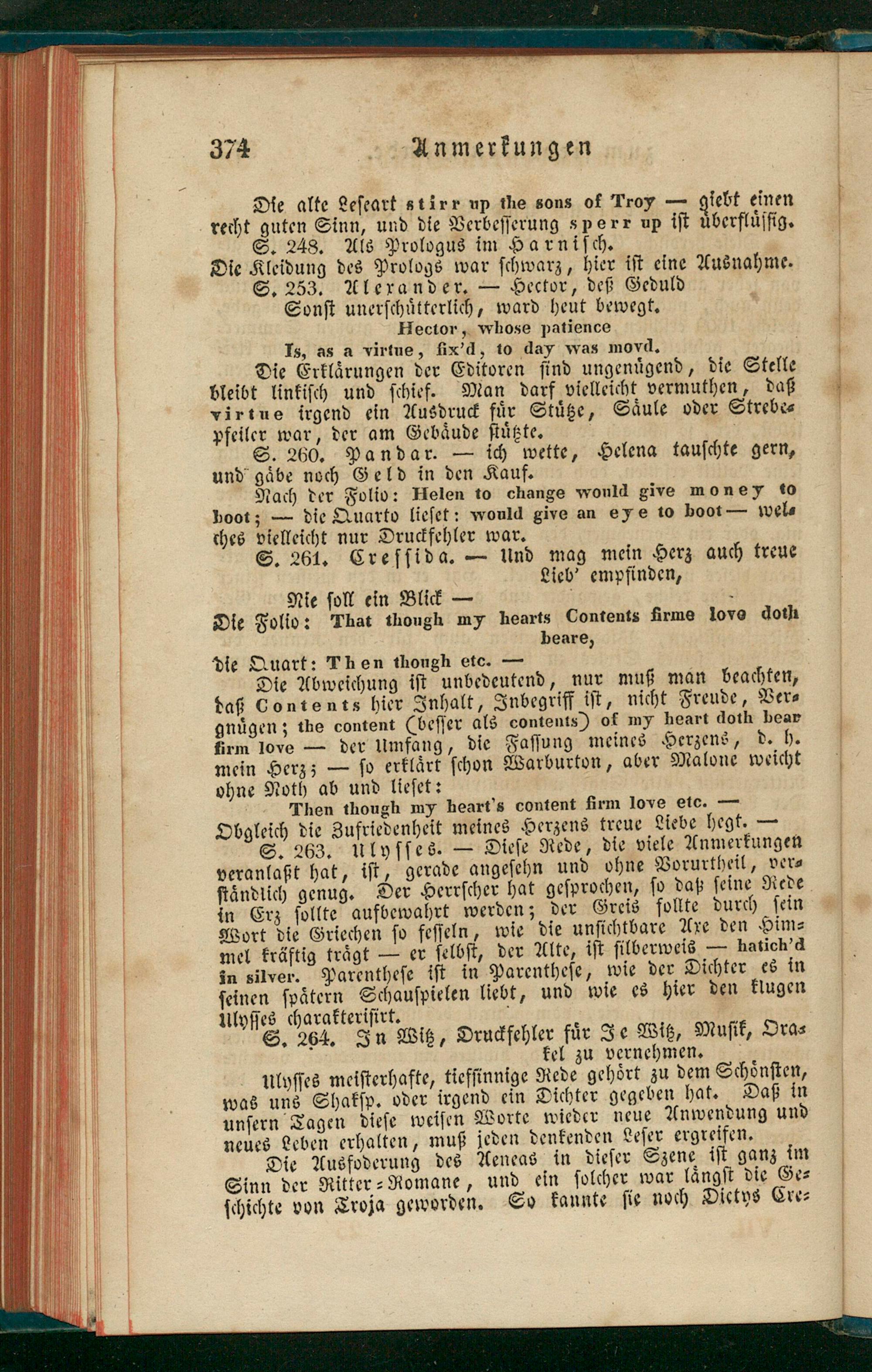 S. 263. ulyſſes.— Dieſe Rede, die viele Anmerkungen veranlaßt hat, iſt, gerade angeſehn und ohne Vorurtheil, ver⸗ ſtändlich genug. Ber Herrſcher hat geſprochen, ſo daß ſeine Rede in Erz ſollte aufbewahrt werden; der Greis follte durch ſein Wort die Griechen ſo feſſeln, wie die unſichtbare Axe den Him⸗ mel kräftig traͤgt— er jelbſt, der Alte, iſt ſilberweis— hatich'd in silver. Parentheſe iſt in Parentheſe, wie der Dichter es in ſeinen ſpaͤtern Schauſpielen liebt, und wie es hier den klugen ulyſſes charakteriſirt.