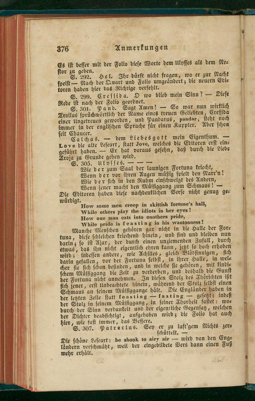 S. 301. Pand. Sagt Amen!— So war nun wirklich Troilus ſpruͤchwoͤrtlich der Name eines treuen Geliebten, Creſſida einer Ungetreuen geworden, und Pandarus, pandar, ſteht noch immer in der engliſchen Sprache fur einen Kuppler. Aber ſchon ſeit Chaucer.