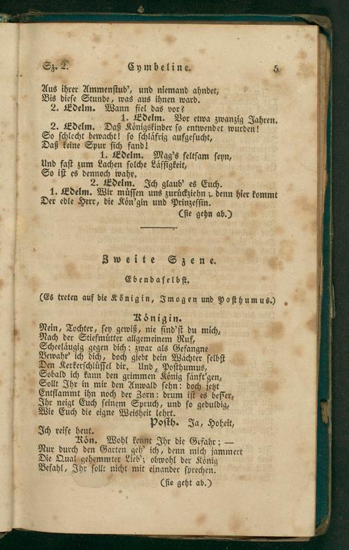 Nein, Tochter, ſey gewiß, nie find'ſt du mich, Nach der Stiefmuͤtter allgemeinem Ruf, Scheelaͤugig gegen dich: zwar als Gefangne Bewahr' ich dich, doch giebt dein Waͤchter ſelbſt Den Kerkerſchluͤſſel dir. Und„Poſthumus, Sobald ich kann den grimmen Koͤnig ſaͤnft'gen, Sollt Ihr in mir den Anwald ſehn: doch jetzt Entflammt ihn noch der Zorn; drum iſt es beſſer, Ihr neigt Euch ſeinem Spruch, und ſo geduldig, Wie Euch die eigne Weisheit lehrt.