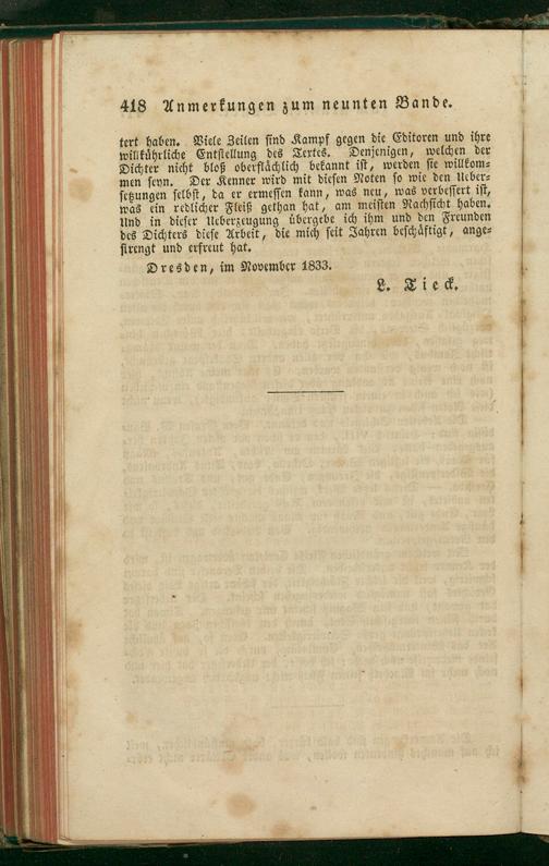 tert haben. Viele Zeilen ſind Kampf gegen die Editoren und ihre willkuͤhrliche Entſtellung des Tertes. Denjenigen, welchen der Dichter nicht bloß oberflaͤchlich bekannt iſt, werden ſie willkom⸗ men ſeyn. Der Kenner wird mit dieſen Noten ſo wie den Ueber⸗ ſetzungen ſelbſt, da er ermeſſen kann, was neu, was verbeſſert iſt, was ein redlicher Fleiß gethan hat, am meiſten Nachſicht haben. Und in dieſer Ueberzeugung uͤbergebe ich ihm und den Freunden des Dichters dieſe Arbeit, die mich ſeit Jahren beſchaͤftigt, ange⸗ ſtrengt und erfreut hat. Dresden, im November 1833.
