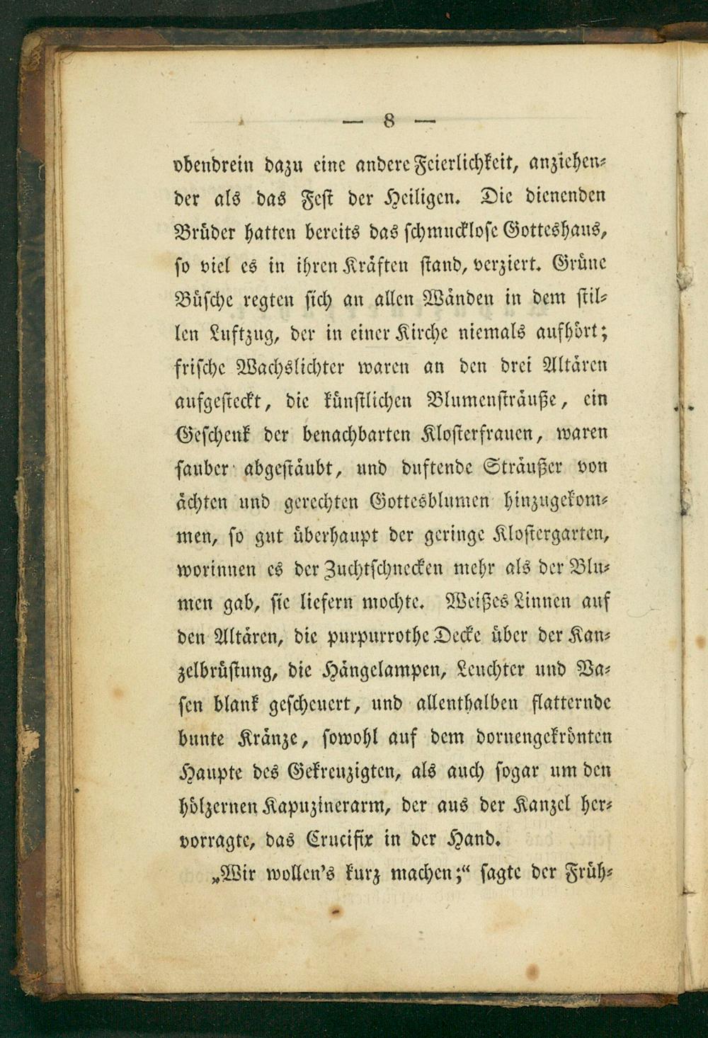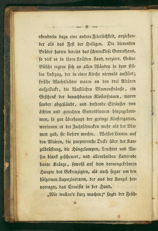 obendrein dazu eine andere Feierlichkeit, anziehen⸗ der als das Feſt der Heiligen. Die dienenden Broͤder hatten bereits das ſchmuckloſe Gotteshaus, ſo viel es in ihren Kraͤften ſtand, verziert. Gruͤne Buͤſche regten ſich an allen Waͤnden in dem ſtil⸗ len Luftzug, der in einer Kirche niemals aufhoͤrt; friſche Wachslichter waren an den drei Altären aufgeſteckt, die kuͤnſtlichen Blumenſtraͤuße, ein Geſchenk der benachbarten Kloſterfrauen, waren ſauber abgeſtaͤubt, und duftende Sträußer von aͤchten und gerechten Gottesblumen hinzugekom⸗ men, ſo gut uberhaupt der geringe Kloſtergarten, worinnen es der Zuchtſchnecken mehr als der Blu⸗ men gab, ſie liefern mochte. Weißes Linnen auf den Altären, die purpurrothe Decke uͤber der Kan⸗ zelbruͤſtung, die Hängelampen, Leuchter und Va⸗ ſen blank geſcheuert, und allenthalben flatternde bunte Kraͤnze, ſowohl auf dem dornengekroͤnten
