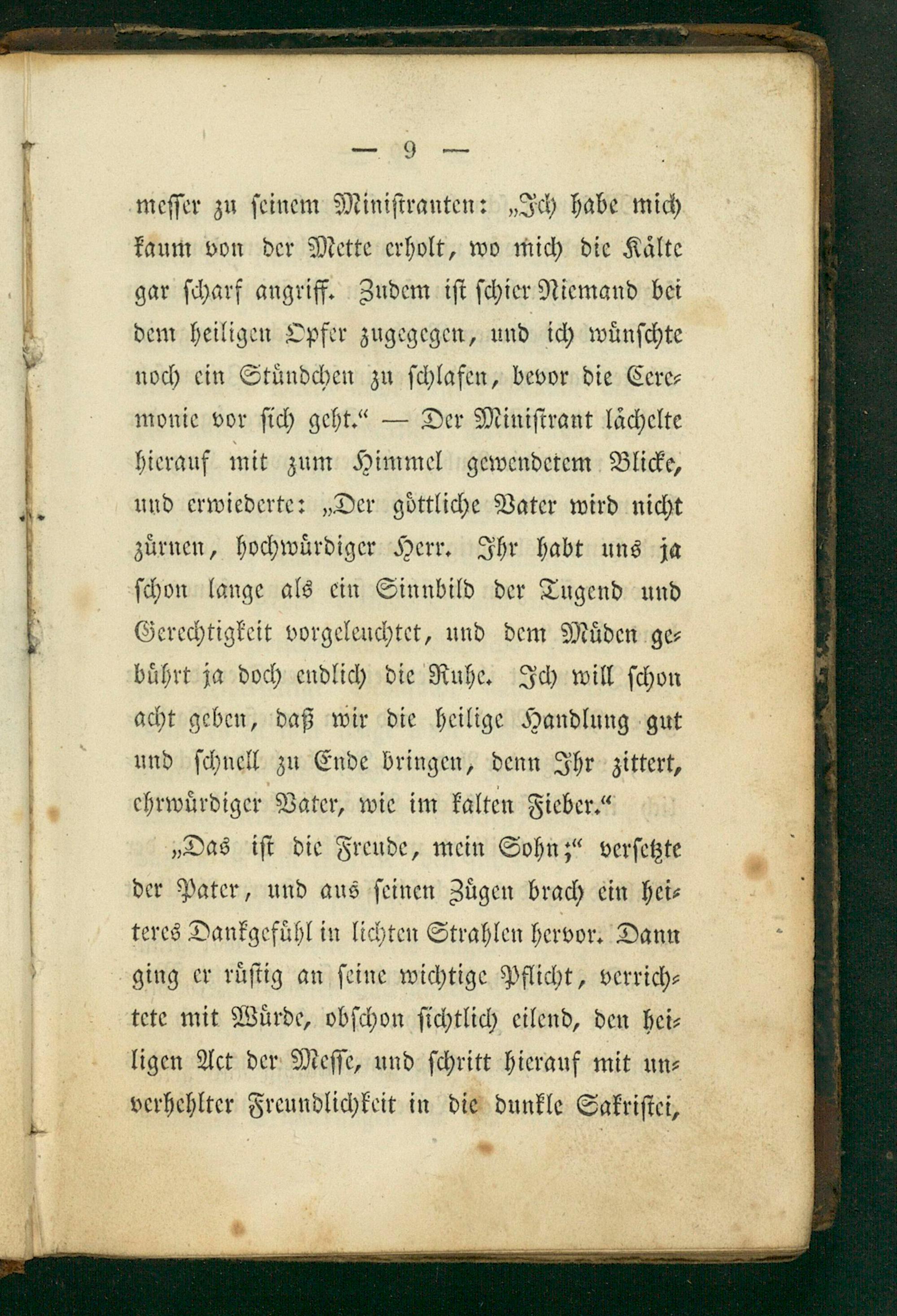 meſſer zu ſeinem Miniſtranten:„Ich habe mich kaum von der Mette erholt, wo mich die Kälte gar ſcharf angriff. Zudem iſt ſchier Niemand bei dem heiligen Opfer zugegegen, und ich wuͤnſchte noch ein Stuͤndchen zu ſchlafen, bevor die Cere⸗ monie vor ſich geht.“— Der Miniſtrant lächelte hierauf mit zum Himmel gewendetem Blicke, und erwiederte:„Der goͤttliche Vater wird nicht zuͤrnen, hochwuͤrdiger Herr. Ihr habt uns ja ſchon lange als ein Sinnbild der Tugend und Gerechtigkeit vorgeleuchtet, und dem Muͤden ge⸗ buͤhrt ja doch endlich die Ruhe. Ich will ſchon acht geben, daß wir die heilige Handlung gut und ſchnell zu Ende bringen, denn Ihr zittert, ehrwuͤrdiger Vater, wie im kalten Fieber.“ „Das iſt die Freude, mein Sohn;“ verſetzte der Pater, und aus ſeinen Zuͤgen brach ein hei⸗ teres Dankgefuͤhl in lichten Strahlen hervor. Dann ging er ruͤſtig an ſeine wichtige Pflicht, verrich⸗ tete mit Wuͤrde, obſchon ſichtlich eilend, den hei⸗ ligen Act der Meſſe, und ſchritt hierauf mit un⸗ verhehlter Freundlichkeit in die dunkle Sakriſtei,