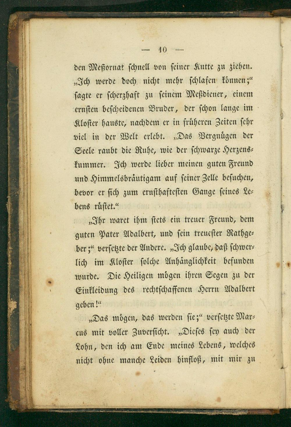„Ihr waret ihm ſtets ein treuer Freund, dem guten Pater Adalbert, und ſein treueſter Rathge⸗ ber;“ verſetzte der Andere.„Ich glaube, daß ſchwer⸗ lich im Kloſter ſolche Anhänglichkeit befunden wurde. Die Heiligen moͤgen ihren Segen zu der Einkleidung des rechtſchaffenen Herrn Adalbert geben!“