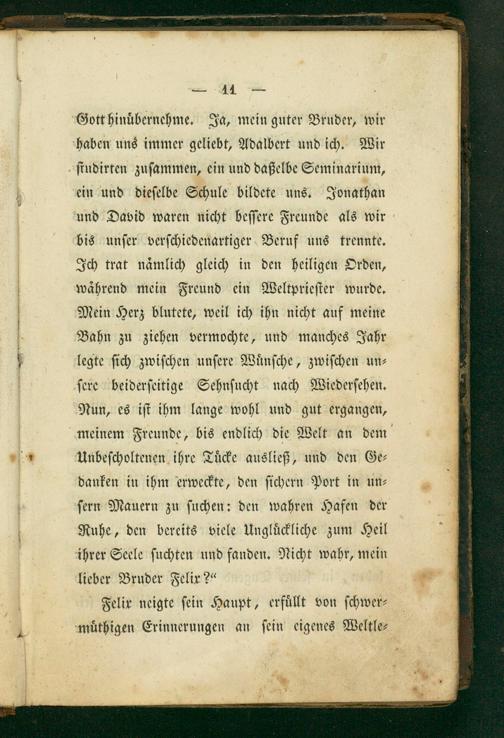 Gott hinuͤbernehme. Ja, mein guter Bruder, wir haben uns immer geliebt, Adalbert und ich. Wir ſtudirten zuſammen, ein und daßelbe Seminarium, ein und dieſelbe Schule bildete uns. Jonathan und David waren nicht beſſere Freunde als wir bis unſer verſchiedenartiger Beruf uns trennte. Ich trat naͤmlich gleich in den heiligen Orden, waͤhrend mein Freund ein Weltprieſter wurde. Mein Herz blutete, weil ich ihn nicht auf meine Bahn zu ziehen vermochte, und manches Jahr legte ſich zwiſchen unſere Wuͤnſche, zwiſchen un⸗ ſere beiderſeitige Sehnſucht nach Wiederſehen. Nun, es iſt ihm lange wohl und gut ergangen,
