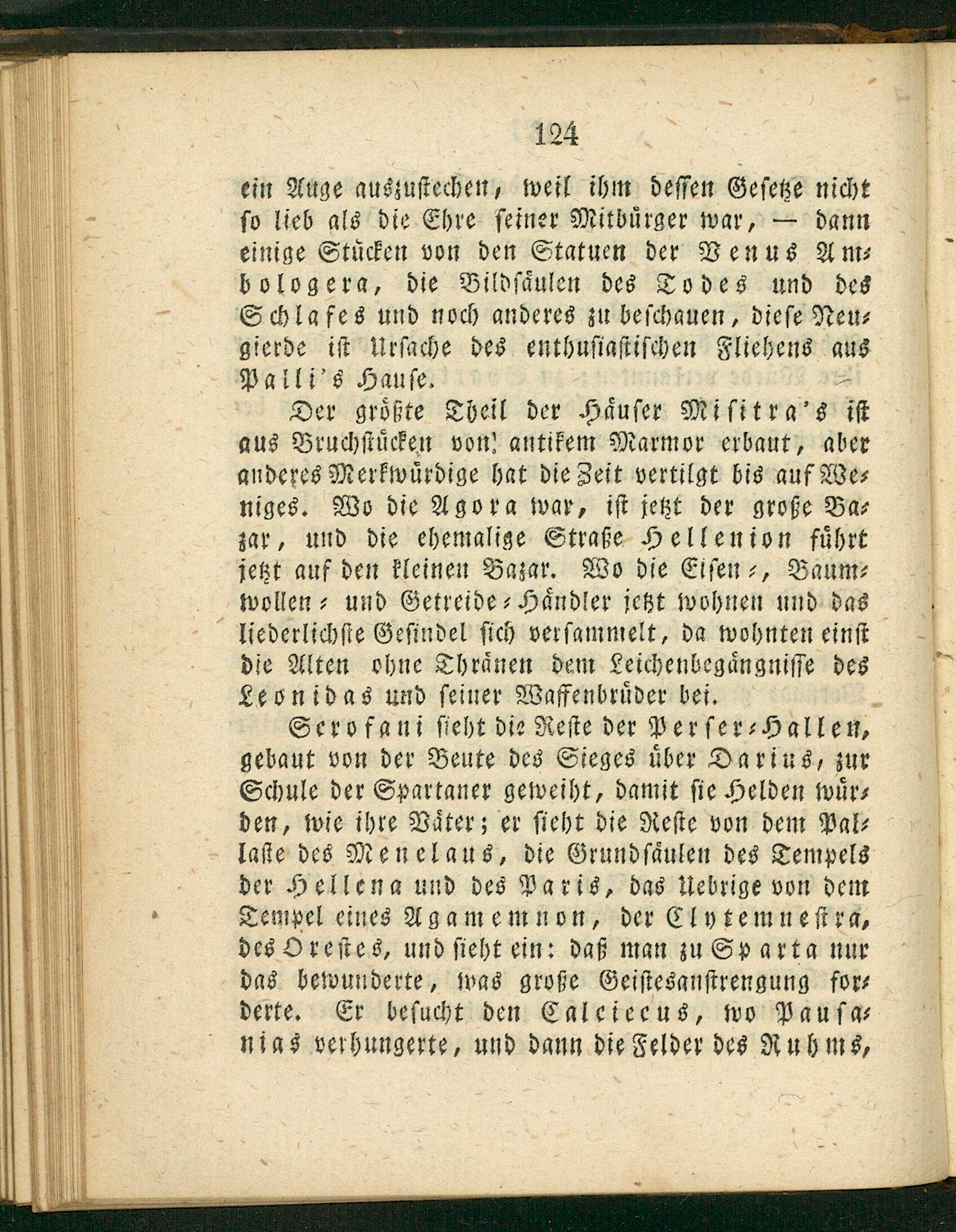 ein Auge auszuſtechen, weil ihm deſſen Geſetze nicht ſo lieb als die Ehre ſeiner Mitbuͤrger war,— dann einige Stuͤcken von den Statuen der Venus Am⸗ bologera, die Bildſaͤulen des Dodes und des Schlafes und noch anderes zu beſchauen, dieſe Neu⸗ gierde iſt Urſache des enthuſiaſtiſchen Fliehens aus Palli's Hauſe.. Der groͤßte Döeil der Haͤuſer Miſitra's iſt aus Bruchſtuͤcken von antikem Marmor erbaut, aber anderes Merkwuͤrdige hat die Zeit vertilgt bis auf We⸗ niges. Wo die Agora war, iſt jetzt der große Ba⸗ zar, und die ehemalige Straße Hellenion fuͤhrt jetzt auf den kleinen Bazar. Wo die Eiſen⸗, Baum⸗ wollen- und Getreide⸗Haͤndler jetzt wohnen und das liederlichſte Geſindel ſich verſammelt, da wohnten einſt die Alten ohne Thraͤnen dem Leichenbegaͤngniſſe des Leonidas und ſeiner Waffenbruͤder bei.