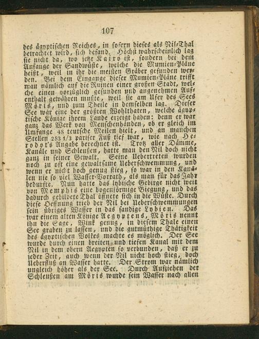 des aͤgyptiſchen Reiches, in ſofern dieſes als Ril⸗Thal betrachtet wird, ſich befand. Hoͤchſt wahrſcheinlich lag ſie nicht da, wo jetzt Kairs iſt, ſondern bei dem Anfange der Sandlvuͤſte, welche die Mumien⸗Pläne heißt, weil in ihr die meiſten Graͤber gefunden wer⸗ den. Vei dem Eingange dieſer Mumien⸗Plaͤne trifft man naͤmlich auf die Ruinen einer großen Stadt, wel⸗ che einen vorzuglich geſunden und angenehmen Auf⸗ enthalt gewaͤhren mußte, weil ſie am Ufer des Sees Moͤris, und zum Theile in demſelben lag. Dieſer See war eine der großten Wohlthaten, welche agyp⸗ üiſche Könige ihrem Lande erzeigt haben; denn er war ganz das Werk von Menſchenhaͤnden, ob er gleich im Umfange 48 teutſche Meilen hielt, und an manchen Stellen 283 4/3 parifer Fuß tief war, wie nach He⸗ rodot's Angabe berechnet iſt. Crotz aller Dämme, Kanaͤle und Schleußen, hatte man den Nil doch nicht ganz in ſeiner Gewalt. Seine Uebertreten wurden noch zu oft eine gewaltſame Ueberſchwemmung, und wenn er nicht hoch genus ſtieg, ſo war in den Kans⸗ len nie ſo viel Waſſer⸗Vorrath, als man fuͤr das Jahr bedurfte. Nun hatte das lubiſche Gebirge nicht weit von Memphis eine bogenförmige Viegung, und das dadurch gebildete Thal oͤffnete ſich in die Wuͤſte. Durch dieſe Beffnung trieb der Nil bei Ueberſchwemmungen ſein äbriges Waſſer in das ſandige Lybien. Das war einem alten Konige Aegyptens, Moͤris nennt ihn die Sage, Wink genug, in dieſem Thale einen See graben zu laſſen, und die gutmuͤthige Thätigkeit des aͤgyptiſchen Volkes machte es möglich. Der See wurde durch einen hreiten und tiefen Kanal mit dem Ril in dem obern Aegypten ſo verbunden, daß er zu ſeder Zeit, auch wenn der Nil nicht hoch ſtieg, doch Ueberſtuß an Waſſer hatte. Der Strom war nämlich ungleich hoͤher als der See. Durch Aufsiehen der Schleußen am Moͤris wunde ſein Waſſer nach allen