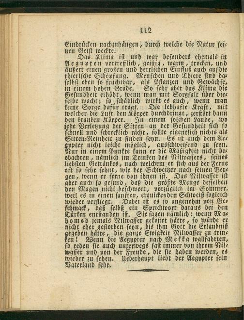 ur in einem Punkte kann er die Mäßigkeit nicht be⸗ obachten, nämlich im Trinken des Nilwaſſers, ſeines liebſten Getraͤnkes, nach welchem er ſich gus der Ferne oft ſo ſehr ſehnt, wie der Schweitzer nach ſeinen Ber⸗ gen, wenn er ferne von ihnen iſt. Das Nilwaſſer iſt aber auch ſo geſund, daß die groͤßte Meuge deſſelben den Magen nicht beſchwert, vorzuͤglich im Sommer, weil es in einen ſanften, erguickenden Schweiß ſogleich wieder verfliegt. Dabei iſt es ſo angenehm von Ge⸗ ſchmack, daß ſelbſt ein Sprichwort daraus bei den Türken entſtanden iſt. Sie ſagen naͤmlich: wenn Ma⸗ homsd jemals Nilwaſſer gekoſtet haͤtte, ſo wuͤrde er nicht eher geſtorben ſeyn, bis ihm Gott die Erlaubnitß egeben haͤtte, die ganze Ewigkeit Nilwaſſer zu trin⸗ en! Wenn die Aegypter nach Mekka walfahrten, ſo reden ſie auch unferwwegs faſt immer von ihrem Nil⸗