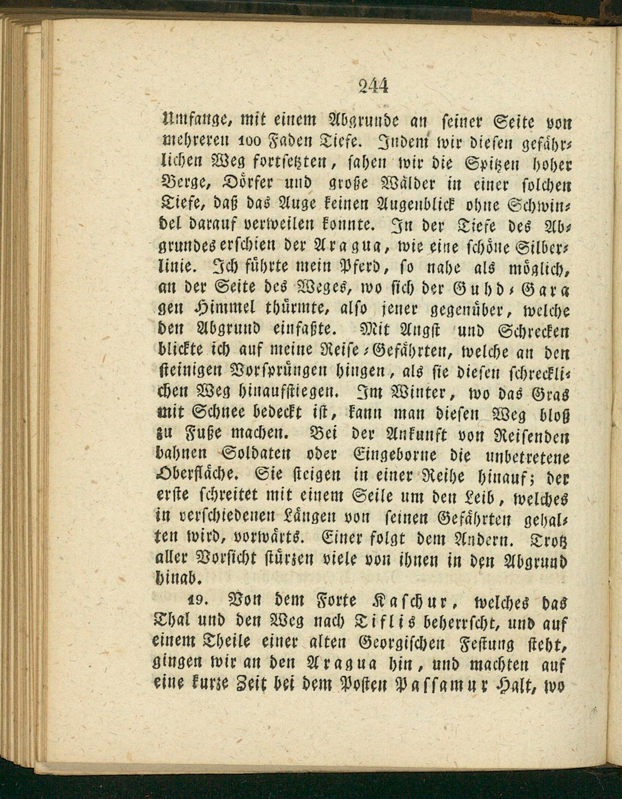 19. Von dem Forte Kaſchur, welches das Thal und den Weg nach Liflis beherrſcht, und auf einem Theile einer alten Georgiſchen Feſtung ſteht, gingen wir an den Aragua hin, und machten auf eine kurie Zeit bei dem Poſten Paſſamur Halt, wo