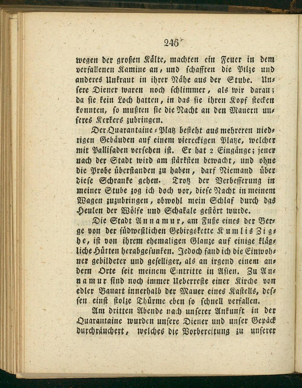 Der Quarantaine⸗Platz beſteht aus mehreren nied⸗ rigen Gebaͤuden auf einem viereckigen Platze, welcher mit Palliſaden verſehen iſt. Er hat 2 Eingaͤnge; jener nach der Stadt wird am ſtaͤrkſten bewacht, und ohne die Probe uͤberſtanden zu haben, darf Niemand uͤber dieſe Schranke gehen. Drotz der Verbeſſerung in meiner Stube zog ich doch vor, dieſe Nacht in meinem Wagen zuzubringen, obwohl mein Schlaf durch das Heulen der Woͤlfe und Schakale geſtoͤrt wurde.