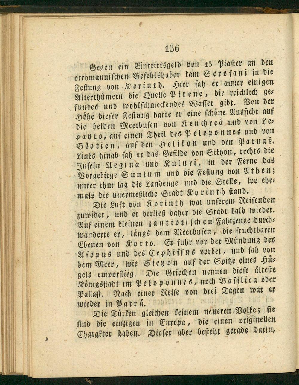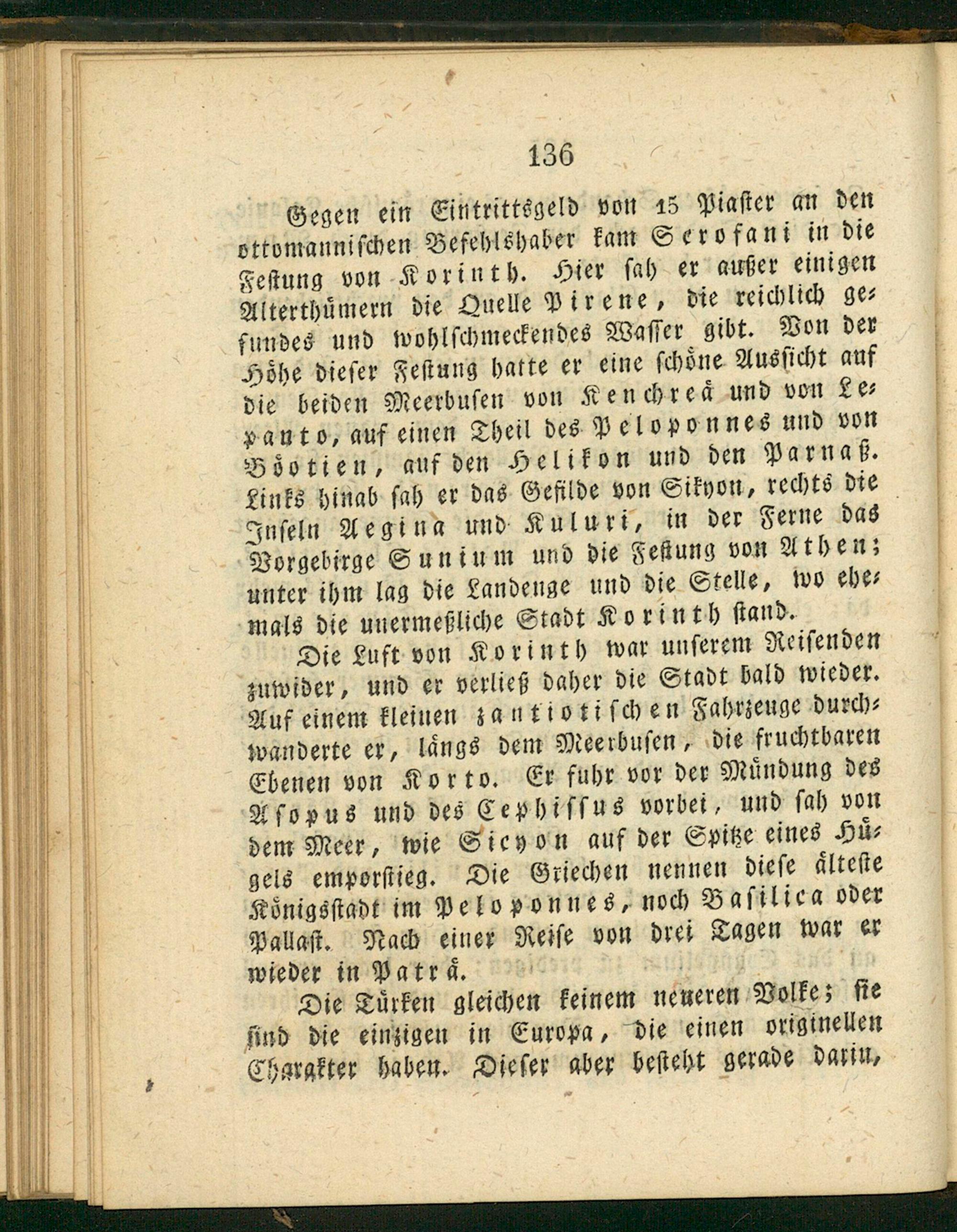 Gegen ein Eintrittsgeld von 15 Piaſter an den ottomanniſchen Befehlshaber kam Serofani in die Feſtung von K orinth. Hier ſah er außer einigen Alterthuͤmern die Quelle Pirene, die reichlich ge⸗ fundes und wohlſchmeckendes Waſſer gibt. Von der Hoͤhe dieſer Feſtung hatte er eine ſchoͤne Ausſicht auf die beiden Meerbuſen von Kenchres und von Le⸗ vanto, auf einen Theil des P eloponnes und von Böotien, auf den Helikon und den Parnaß.
