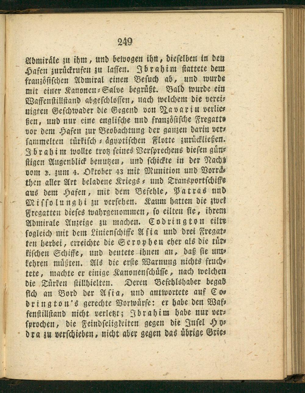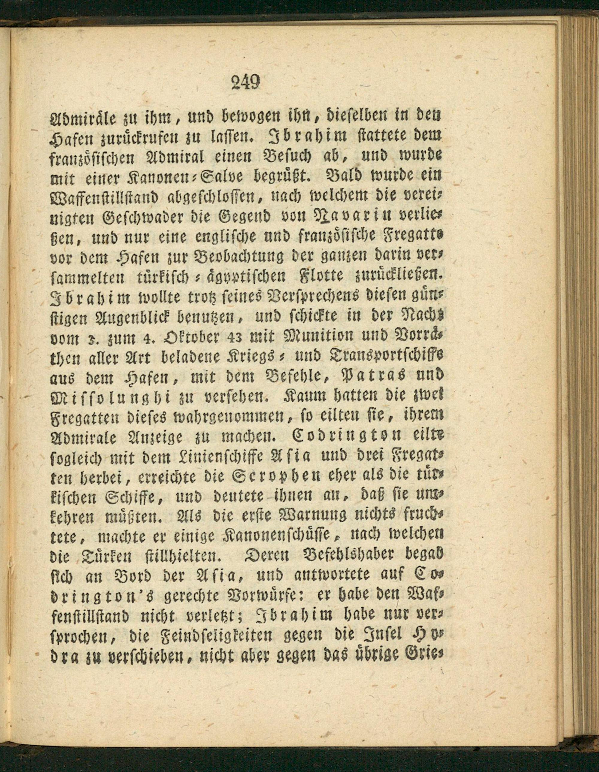 249 Qdmiraͤle zu ihm, und bewogen ihn, dieſelben in den Hafen zuruͤckrufen zu laſſen. Ibrahim ſtattete dem franzoſiſchen Admiral einen Beſuch ab, und wurde mit einer Kanonen⸗Salve begruͤßt. Bald wurde ein Waffenſtillſtand abgeſchloſſen, nach welchem die verei⸗ nigten Geſchwader die Gegend von Navarin verlie⸗ ßen, und nur eine engliſche und franzoͤſiſche Fregatte vor dem Hafen zur Beobachtung der ganzen darin vet⸗ ſammelten tuͤrkiſch-aͤgyptiſchen Flotte zuruͤcklieten. Ibrahim wollte trotz ſeines Verſprechens dieſen guͤn⸗ ſtigen Augenblick benutzen, und ſchickte in der Nachs vom z. zum 4. Dktober as mit Munition und Vorrd⸗ then aller Art beladene Kriegs⸗ und Transportſchitfs aus dem Hafen, mit dem Befehle, Patras und Miſſo lunghi zu verſehen. Kaum hatten die zwer Fregatten dieſes wahrgenommen, ſo eilten ſie, ihrem Admirale Anzeige zu machen. Codrington eilte ſogleich mit dem Linienſchiffe Aſia und drei Fregat⸗ ten herbei, erreichte die Serophen eher als die tuͤt⸗ kiſchen Schiffe, und deutete ihnen an, daß ſie um⸗ kehren muͤßten. Als die erſte Warnuns nichts fruch⸗ tete, machte er einige Kanonenſchuͤſſe, nach welchen die Luͤrken ſtillhielten. Deren Befehlshaber begab ſich an Bord der Aſia, und antwortete auf Co⸗ drington's gerechte Vorwuͤrfe: er babe den Wat⸗ fenſtillſtand nicht verletzt; Ibrahim habe nur ver⸗ ſprochen, die Feindſeligkeiten gegen die Inſel Hy⸗ dra zu verſchieben, nicht aber gegen das uͤbrige Grie⸗