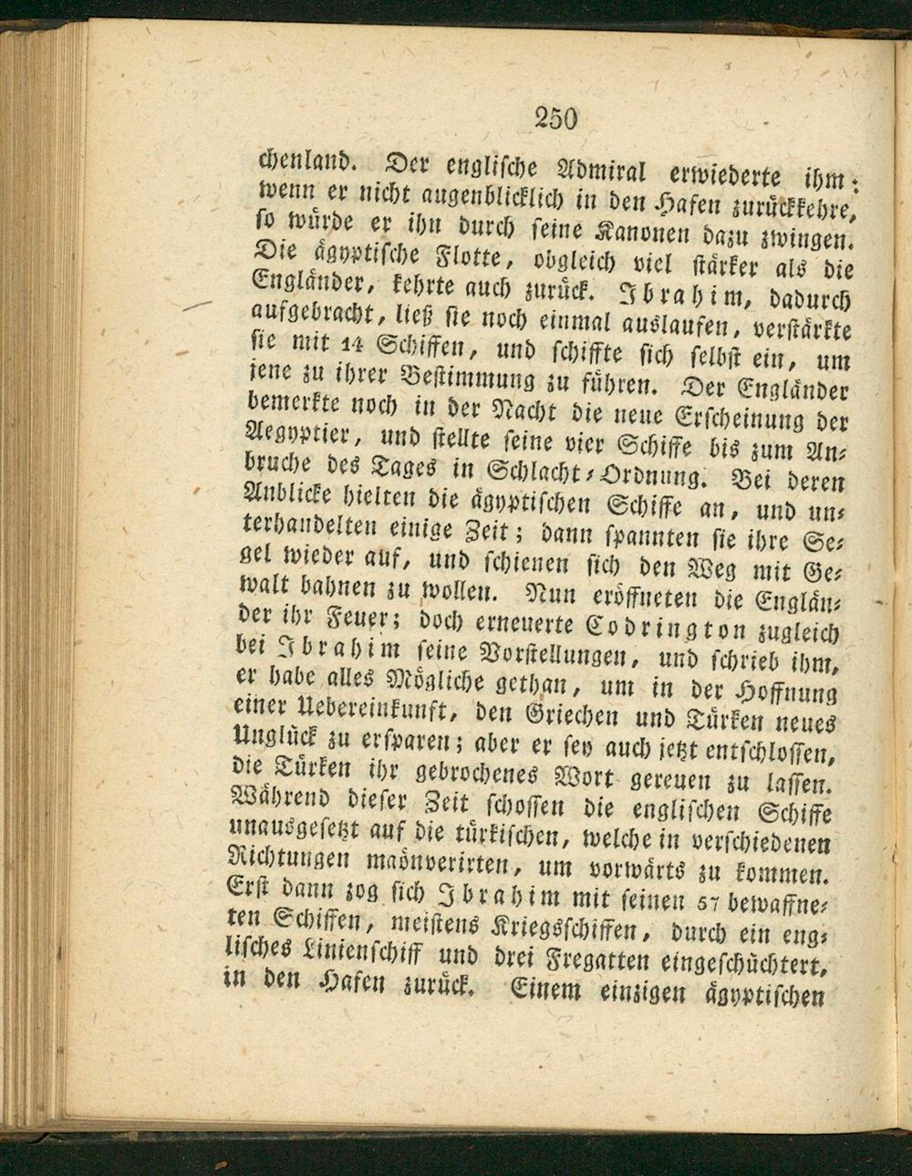 chenland. Der engliſche Admiral erwiederte ihm; wenn er nicht augenblicklich in den Hafen zuruͤckkehre, ſo wuͤrde er ihn durch ſeine Kanonen dazu zwingen. Die aͤgyptiſche Flotte, obgleich viel ſaͤrker als die Englaͤnder, kehrte auch zuruͤck. Ibrahim, dadurch — aufgebracht, ließ ſie noch einmal auslaufen, verſtaͤrkte ſie mit au Schiffen, und ſchiffte ſich ſelbſt ein, um ſene zu ihrer Beſtimmung zu fuͤhren. Der Englaͤnder bemerkte noch in der Nacht die neue Erſcheinung der Aegyptier, und ſtellte ſeine vier Schiffe bis zum An⸗ bruche des Tages in Schlacht⸗Ordnung. Bei deren Anblicke hielten die aͤgyptiſchen Schiffe an, und un⸗ terhandelten einige Zeit; bann ſpannten ſie ihre Se⸗ gel wieder auf, und ſchienen ſich den Weg mit Ge⸗ walt bahnen zu wollen. Nun eroͤfneten die Englaͤn⸗ der ihr Feuer; doch erneuerte Codrington zugleich bei Ibrahim ſeine Vorſtellungen, und ſchrieb ihm, er habe alles Moͤgliche gethan, um in der Hoffnung einer Uebereinkunft, den Griechen und Luͤrken neues Unglück zu erſparen; aber er ſey auch jetzt entſchloſſen, die Tuͤrken ihr gebrochenes Wort gereuen zu laſſen. Waͤhrend dieſer Zeit ſchoſſen die engliſchen Schiffe unausgeſetzt auf die turkiſchen, welche in verſchiedenen Richtungen maoͤnverirten, um vorwaͤrts zu kommen. ſ Erſt dann zog ſich Jbrahim mit ſeinen s7 bewaffne⸗ ten Schiffen, meiſtens Kriegsſchiffen, durch ein eng⸗ liſches Linienſchiß und drei Fregatten eingeſchüchtert, in den Hafen zuruͤck. Einem einzigen aͤgyptiſchen