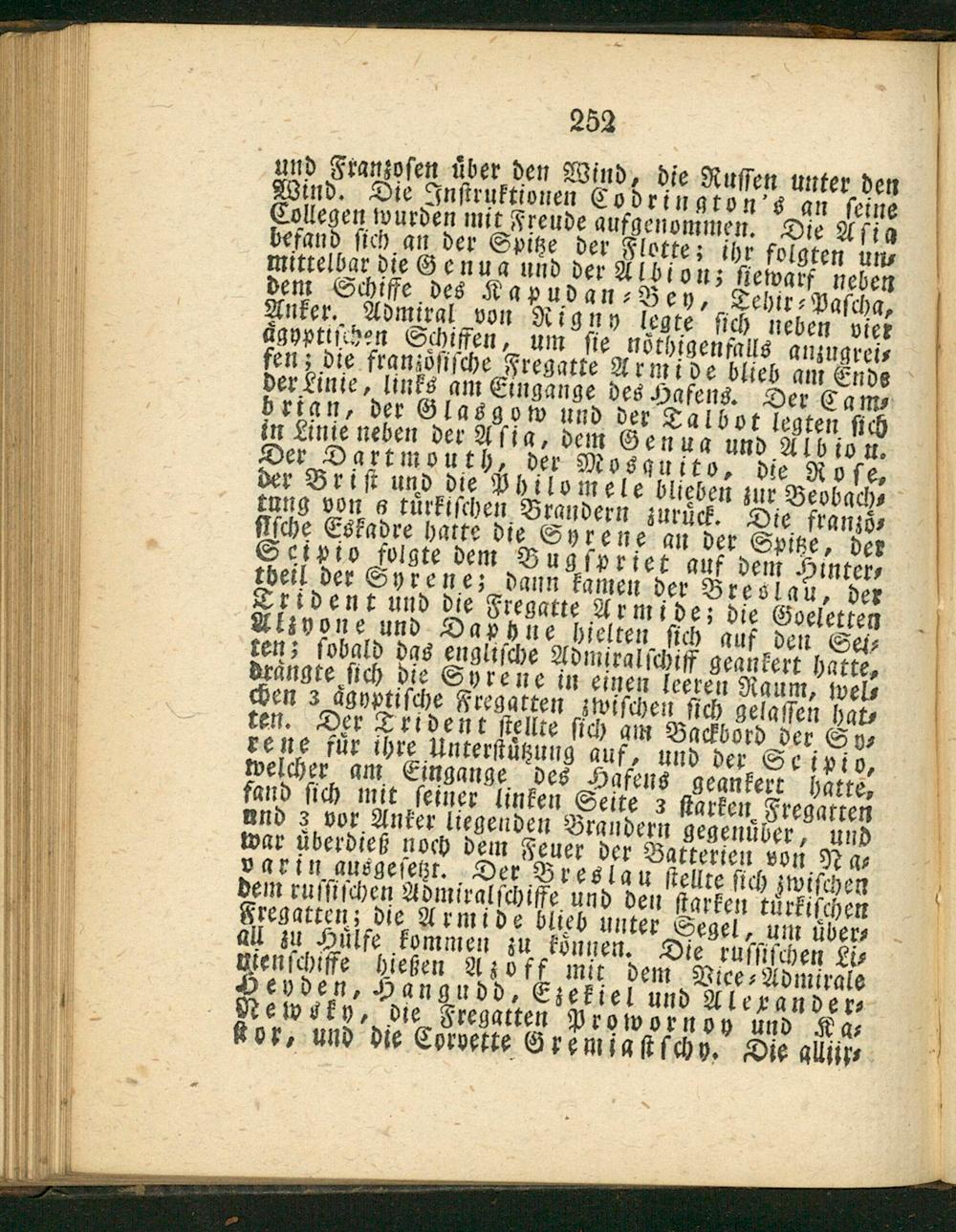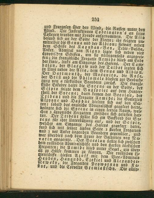 tung von 6 tüͤrkiſchen Brandern zuruͤck. Die franzö⸗ ſlſche Eskadre hatte die Syrene an der Spitze, der Scipio folgte dem B ugſpriet auf dem Hinter⸗ tbeil der Syrene; dann kamen der Breslau, der Srident und die Fregatte Armide; die Goeletten Alzvone und Daphne hielten ſich auf den Sel⸗ ten; fobald das engliſche Admiralſchiff geankert hatte, draͤngte ſich die Syrene in einen leeren Raum, wel⸗ chen 3 aͤgyptiſche Fregatten zwiſchen ſich gelaſſen hat⸗ ten. Der Trident ſtellte ſich um Backbord der Sp⸗ rene für ihre Unterſtuͤtzung auf, und der Seipio, welcher am Eingange des Pafens geankert hatte⸗ fand ſich mit ſeiner linken Seite 3 ſtarken Fregatten und 3 vor Anker liegenden Brandern gegenüber, und war überdieß noch dem Feuer der Batterten son Na⸗ varin ausgeſetzt. Der Breslau ſtellte ſich zwiſchen dem ruſſiſchen Abmiralſchiffe und den ſtarken tuͤrkiſchen Fregatten; die Armide blieb unter Segel, um über⸗ all zu Hülfe kommen zu koͤngen. Die ruſſiſchen Li⸗ ienſchiffe hießen Azoff mit dem Vice⸗Admirale