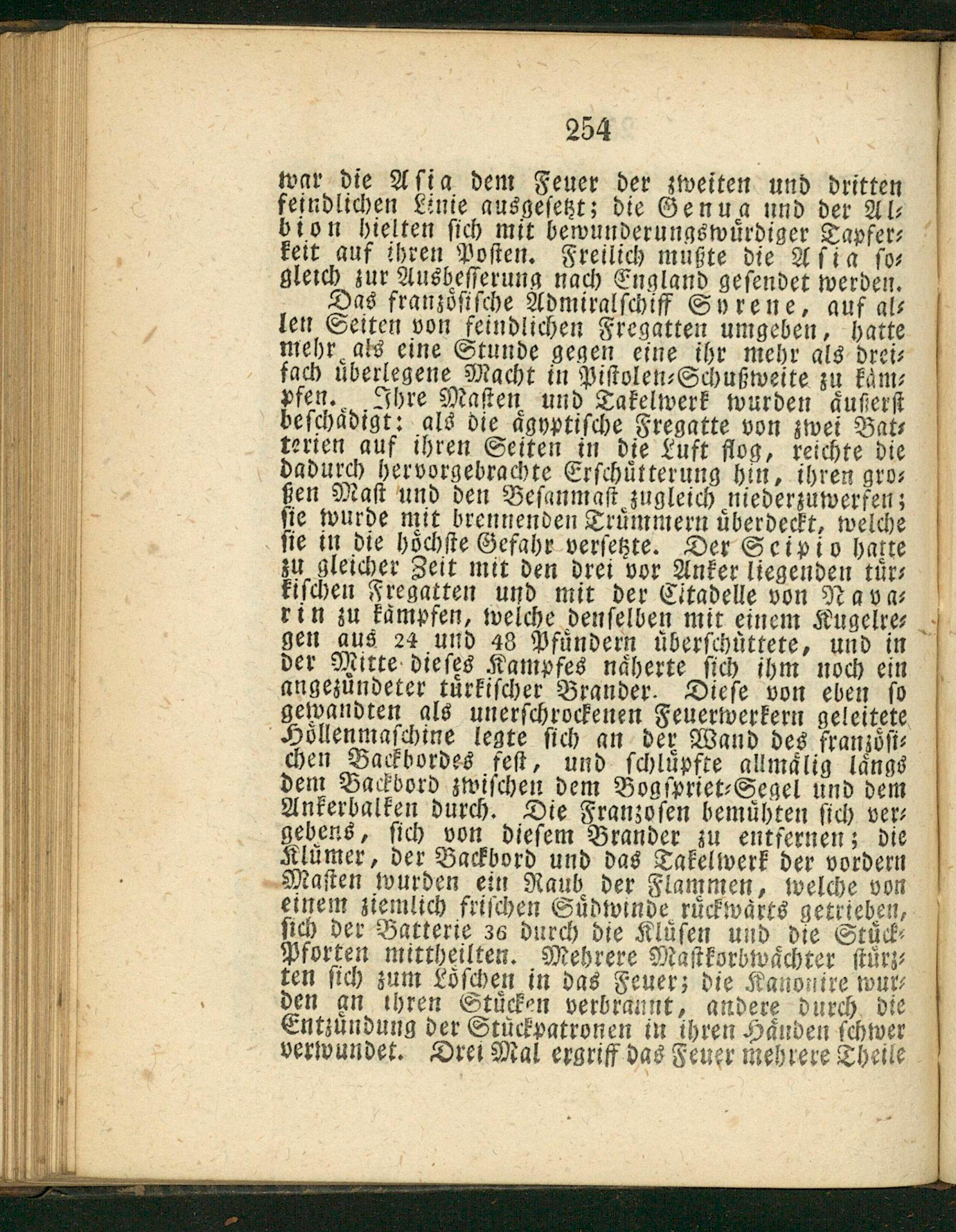 Das franzoͤſiſche Admiralſchiff Syrene, auf al⸗ len Seiten von feindlichen Fregatten umgeben, hatte mehr als eine Stunde gegen eine ihr mehr als drei⸗ fach üͤberlegene Macht in Piſtolen⸗Schußweite zu kam⸗ pfen. Ihre Maſten und Takelwerk wurden äußerſt beſchaͤdigt: als die ägyptiſche Fregatte von zwei Bat⸗ terien auf ihren Seiten in die Luft flog, reichte die dadurch hervorgebrachte Erſchuͤtterung hin, ihren gro⸗ ßen Maſt und den Beſanmaſt zugleich niederzuwerfen; ſie wurde mit brennenden Truͤmmern uͤberdeckt, welche ſie in die hoͤchſte Gefahr verſetzte. Der Seipio hatte zu gleicher Zeit mit den drei vor Anker ſegenden tuͤr⸗ kiſchen Fregatten und mit der Citadelle von Nava⸗ rin zu kämpfen, welche denſelben mit einem Kugelre⸗