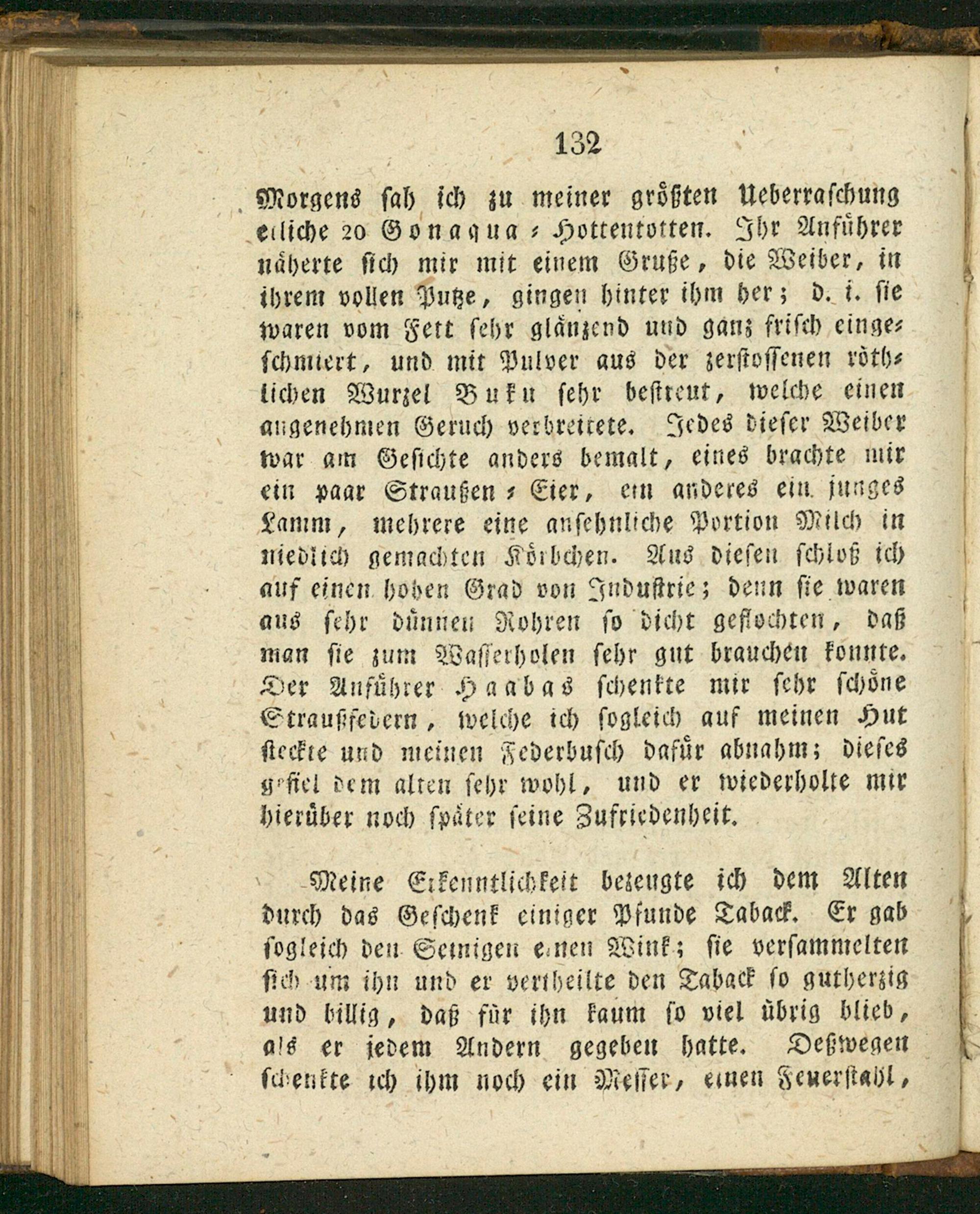Morgens ſ ſch zu meiner groͤßten Veberzaſchung eiliche 20 Gonagua⸗ Hottentotten. Ihr Anfuͤhrer naͤherte ſich mir mit einem Gruße, die Weiber, in ihrem vollen Putze, gingen hinter ihm her; d. i. ſie waren vom Fett ſehr glaͤnzend und ganz friſch einge⸗ ſchmiert, und mit Pulver aus der zerſtoſſenen roͤth⸗ lichen Wurzel Bukn ſehr beſtreut, welche einen angenehmen Geruch verbreitete. Jedes dieſer Weiber war am Geſichte anders bemalt, eines brachte mir ein paar Straußen⸗Eier, em anderes ein junges Lamm, mehrere eine anſehnliche Portion Milch in niedlich gemachten Koͤrbchen. Aus dieſen ſchloß ich auf einen hoben Grad von Induſtrie; denn ſie waren aus ſehr duͤnnen Rohren ſo dicht geflochten, daß man ſie zum Waſſerholen ſehr gut brauchen konnte. Der Anfuͤhrer Haabas ſchenkte mir ſehr ſchoͤne Straußfedern, welche ich ſogleich auf meinen Hut ſteckte und meinen Federbuſch dafuͤr abnahm; dieſes geſiel dem alten ſehr wohl, und er wiederholte mir hieruͤber noch ſpaͤter ſeine Zufriedenheit.