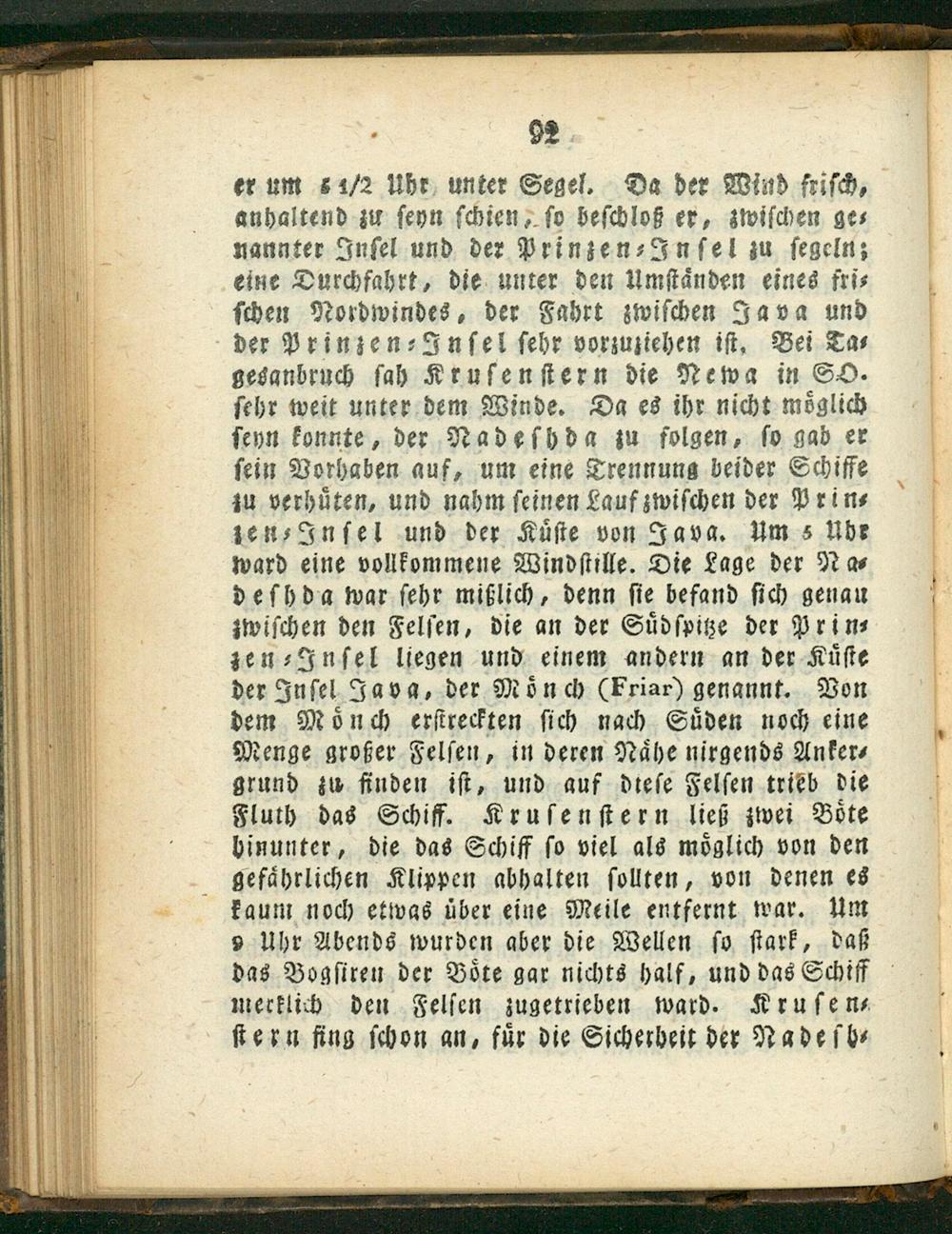 er um s/ Uhr unter Segel. Da der Wind friſch, anhaltend zu ſeyn ſchien, ſo beſchloß er, zwiſchen ge⸗ nannter Inſel und der Prinzen⸗Inſel zu ſegeln; eine Durchfahrt, die unter den Umſtaͤnden eines fri⸗ ſchen Nordwindes, der Fahrt zwiſchen Java und der Prinzen⸗Inſel ſehr vorzuziehen iſt. Bei Ta⸗ gesanbruch ſah Kruſenſtern die Newa in SO. ſehr weit unter dem Winde. Da es ihr nicht moͤglich ſeyn konnte, der Nadeſhda zu ſolgen, ſo gab er ſein Vorhaben auf, um eine Trennuns beider Schiffe zu verhuͤten, und nahm ſeinen Laufzwiſchen der Prin⸗ ten⸗Inſel und der Kuͤſte von Java. Um s Ubr ward eine vollkommene Windſtille. Die Lage der Na⸗ deſhda war ſehr mißlich, denn ſie befand ſich genau zwiſchen den Felſen, die an der Suͤdſpitze der Prin⸗ zen⸗Inſel liegen und einem andern an der Kuͤſte der Inſel Java, der Moͤnch(Friar) genannt. Von em Moͤnch erſtreckten ſich nach Suͤden noch eine Menge großer Felſen, in deren Naͤhe nirgends Anker⸗ grund zu ſinden iſt, und auf dteſe Felſen trieb die Fluth das Schiff. Kruſenſtern ließ zwei Boͤte binunter, die das Schiff ſo viel als moͤglich von den gefahrlichen Klippen abhalten ſollten, von denen es kaum noch etwas uͤber eine Meile entfernt war. Um o Uhr Abends wurden aber die Wellen ſo ſtark, daß das Bogſiren der Boͤte gar nichts half, und das Schiff merklich den Felſen zugetrieben ward. Kruſen⸗ ſtern fing ſchon an, fuͤr die Sicherheit der Nadefb⸗
