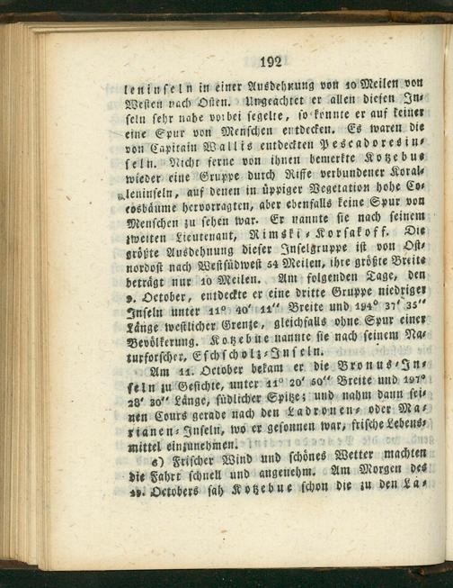 leninſeln in einer Ausdehnung von 40 Meilen von Weſten nach Oüen. Ungeachtet er allen dieſen In⸗ ſeln ſehr nahe vorbei ſegelte, ſo konnte er auf keiner eine Spur von Menſchen entdecken. Es waren die von Cäpitain Wallis entdeckten Pesecadoresin⸗ ſeln. Nicht ferne von ihnen bemerkte Kotzebus wieder eine Gruppe durch Riffe verbundener Koral⸗ gleninſeln, auf denen in uͤppiger Vegetation hohe Co⸗ evsbaͤume hervorragten, aber ebenfalls keine Spur von Menſchen zu ſehen war. Er nannte ſie nach ſeinem zweiten Lieutenaut, Rimski⸗Korſakoff. Die groͤhte Ausdehnung dieſer Inſelgruppe iſt von Dſt⸗ nordoſt nach Weßtſfuͤdweſt s4 Meilen, ihre groͤßte Breite betraͤgt nur 10 Meilen. Am folgenden Tage, den „ Detober, entdeckte er eine dritte Gruppe niedriger Inſeln unter 11* 4o 14 Breite und 1940 37 38“ Laͤnge weſtlicher Grenie⸗ gleichfalls ohne Spur einer Bevoͤlkerung. Kotzebue nanhte ſie nach ſeinem Na⸗ turforſcher, Eſchſcholz⸗Inſeln.. Am 4. Detober bekam er die Bronus⸗In⸗ feln zu Geſichte, unter 44* 20 60“ Breite und 1910 28 30 Länge, ſüdlicher Spitze; und nahm dann ſei⸗ nen Cours gerade nach den Ladronen⸗ oder Ma⸗ vianen⸗Inſeln, wo er geſonnen war, friſche Lebens⸗ mittel einzunehmen. s) Friſcher Wind und ſchoͤnes Wetter machten die Fahrt ſchnell und angenehm. Am Morgen des ap. Detobers ſah Kotzebue ichon die zu den La⸗