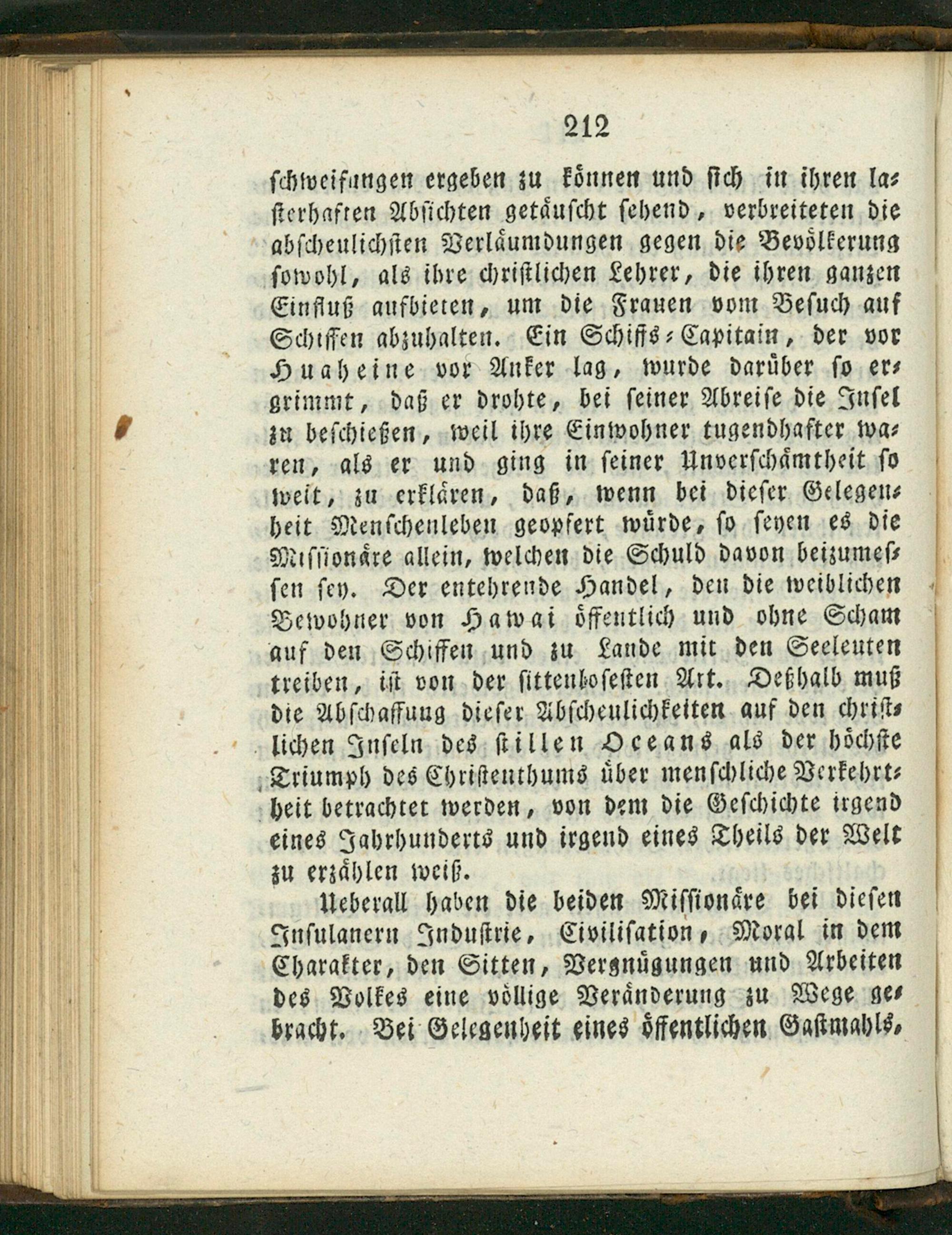 ſchweifungen ergeben zu koͤnnen und ſich in ihren la⸗ ſterhaften Abſichten getaͤuſcht ſehend, verbreiteten die abſcheulichſten Verlaͤumdungen gegen die Bevoͤlkerung ſowohl, als ihre chriſtlichen Lehrer, die ihren ganzen Einfluß aufbieten, um die Frauen vom Beſuch auf Schiffen abzuhalten. Ein Schiffs-Capitain, der vor Huaheine vor Anker lag, wurde daruͤber ſo er⸗ grimmt, daß er drohte, bei ſeiner Abreiſe die Inſel zu beſchießen, weil ihre Einwohner tugendhafter wa⸗ ren, als er und ging in ſeiner Unverſchaͤmtheit ſo weit, zu erklaͤren, daß, wenn bei dieſer Gelegen⸗ heit Menſchenleben geopfert wuͤrde, ſo ſeyen es die Miſſionaͤre allein, welchen die Schuld davon beizumeſ⸗ ſen ſey. Der entehrende Handel, den die weiblichen Bewohner von Hawai öoͤffentlich und ohne Scham auf den Schiffen und zu Lande mit den Seeleuten treiben, iſt von der ſittenloſeſten Art. Deßhalb muß die Abſchaffung dieſer Abſcheulichkeiten auf den chriſt⸗ lichen Inſeln des ſtillen Deeans als der hoͤchſte Sriumph des Chriſtenthums uͤber menſchliche Verkehrt⸗ heit betrachtet werden, von dem die Geſchichte irgend eines Jahrhunderts und irgend eines Theils der Welt zu erzaͤhlen weiß.