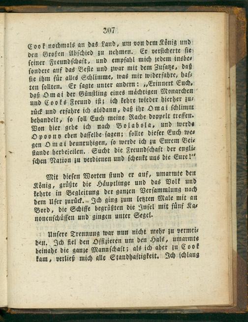 Cvok nochmals an das Land, um von dem Koͤnig und den Großen Abſchied zu nehmen. Er verſicherte ſie ſeiner Freundſchaft, und empfahl mich jedem insbe⸗ ſondere auf das Beſie und zwar mit dem Zuſatze⸗ daß ſie ihm fuͤr alles Schlimme, was mir widerfahre, haf⸗ ten ſollten. Er ſagte unter andern:„Erinnert Euch⸗ daß Omai der Günſtling eines maͤchtigen Monarchen und Cvoks Freund iſt; ich kehre wieder hierher zu⸗ rück und erfahre ich alsdann, daß ihr Omai ſchlimm behandelt, ſo ſoll Euch meine Rache doppelt treffen⸗ Von hier gehe ich nach Bolabola, und werdes Dpvony eben daſſelbe ſagen; ſollte dieſer Euch we⸗ gen Omai beunruhigen, ſo werde ich zu Eurem Bei⸗ ſtande herbeieilen. Sucht die Freundſchaft der engli⸗ ſchen Nation zu verdienen und ſchenkt uns die Eure!“
