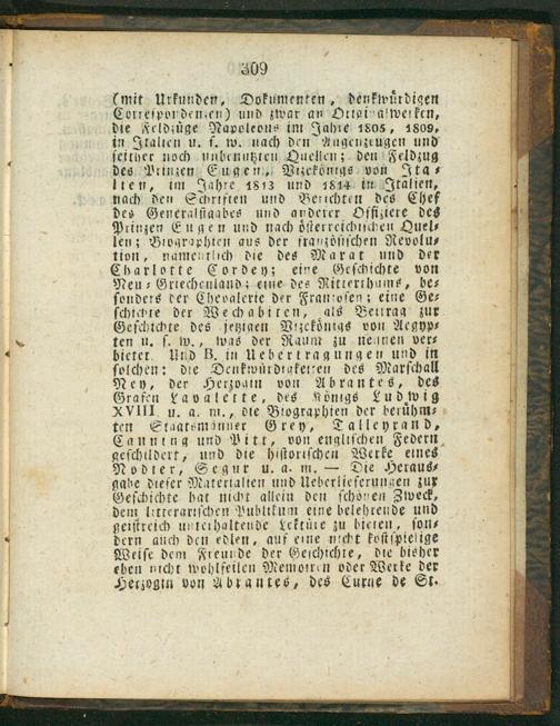 (mit Urkunden, Dokumenten, denkwuͤrdigen Correſpondemen) und zwar an Driginawerken, die Feldzüge Napoleons im Jahre 1806, 1809, in Italten u. ſ. w. nach den Angenzeugen und ſeither noch unbenutzten Quelien; den Feldzug des Prinzen Sugen, Viekontgs von Ita⸗ lien, im Jahre 1813 und 4844 in Italien, nach den Stbriften und Beiiſchten des Chef des Generalſtaabes und anderer Pffiziere des Prinzen Eugen und nach oͤſterreichtſcheu Quel⸗ len; Biographien aus der frabzoͤſiſchen Revolu⸗ tion, namentlich die des Marat und der Charlotte Cordey; eine Geſchichte von Neu⸗Griechenland; eine des Ritterthums, be⸗ ſonders der Chevalerie der Franſoſen; eine Ge⸗ ſchtchte der Wechabiten, als Beirag zur Geſchichte des jetzigen Vtzekoͤnigs von Aegyp⸗ ten u. ſ. w., was der Raum zu neanen ver⸗ bietet Und B. in Uebertragungen und in folchen: die Denkwuͤrdtakenen des Marſchall Ney, der Herzogin von Abrantes, des Grafen Lavälette, des Koͤnigs Ludwig XVIII u. a. m., die Biographien der berühm⸗ ten Staateminner Grey, Talleyrand, Canning und Pitt, von engliſchen Federn. geſchildert, und die hiſtoriſchen Werke eines Nodter, Segur u. a. m.— Die Heraus⸗ gabe dieſer Matertalien und Ueberlieſerungen zur Geſchichte hat nicht allein den ſchonen Zweck, dem litterariſchen ubltkum eine belehrende und geiſtreich unterhaltende Lektuͤre zu bieren, ſon⸗ dern auch den edlen, auf eine wicht koſiſpielige Weiſe dem Freunde der Geſchichte, die bisher eben nicht wohlfeilen Memotren oder Werke der Heriogin von Abrantes, des Curne de St⸗
