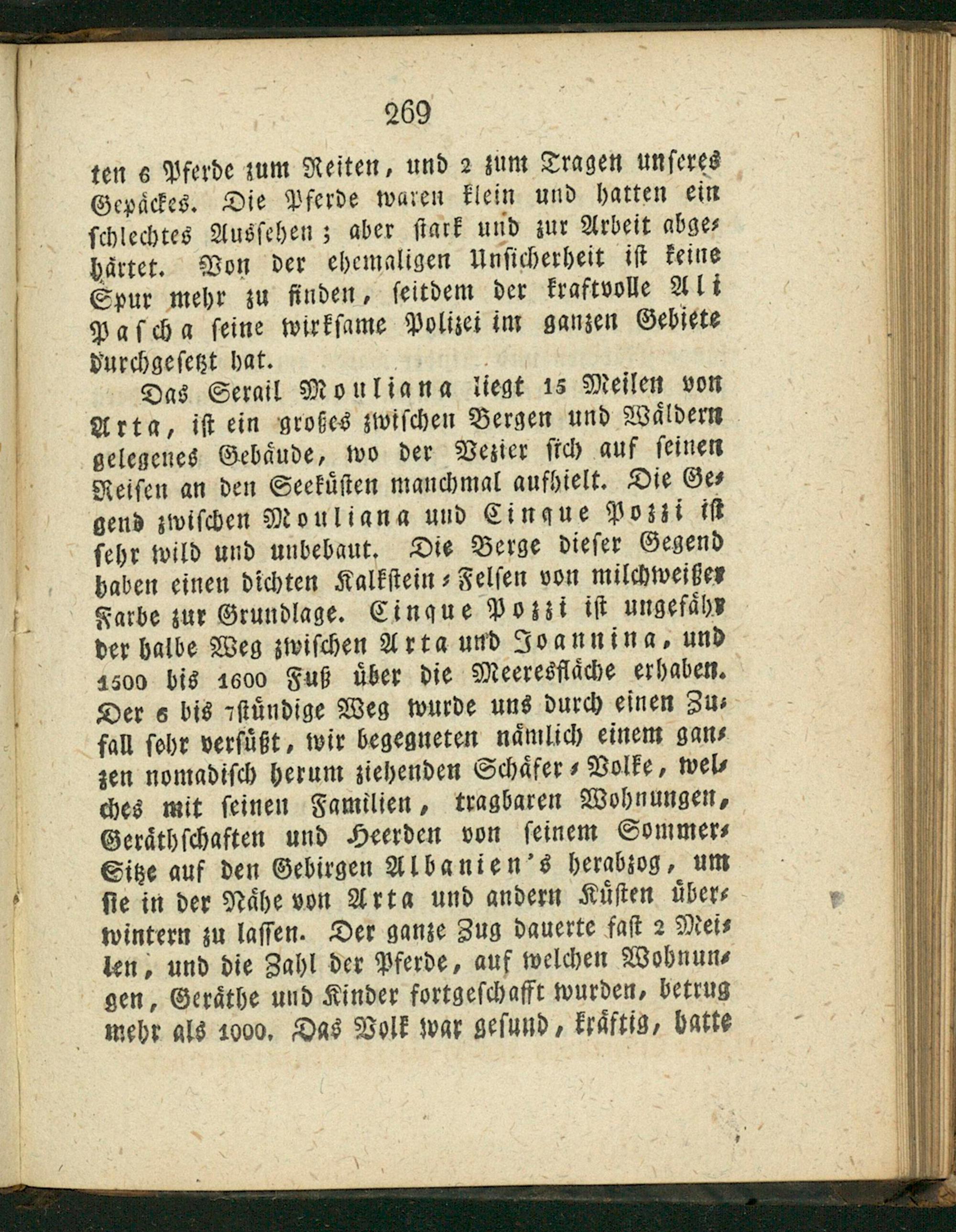 Das Serail Mouliana liegt 15 Meilen von Arta, iſt ein großes zwiſchen Bergen und Waͤldern gelegenes Gebaͤude, wo der Vesier ſich auf ſeinen Reiſen an den Seekuͤſten manchmal aufhielt. Die Ge⸗ gend zwiſchen Mouliana und Cingue Pozzi iſt ſehr wild und unbebaut. Die Berge dieſer Gegend haben einen dichten Kalkſtein⸗Felſen von milchweißen Farbe zur Grundlage. Cingue Pozzi iſt ungefaͤhr der halbe Weg zwiſchen Arta und Jvannina, und 1800 bis 1600 Fuß uͤber die Meereslaͤche erhaben. Der s bis Fſtuͤndige Weg wurde uns durch einen Zu⸗ fall ſehr verſuͤßt, wir begegneten naͤmlich einem gan⸗ zen nomadiſch herum ziehenden Schaͤfer⸗Volke, wel⸗ ches mit ſeinen Familien, tragbaren Wohnungen, Geraͤthſchaften und Heerden von ſeinem Sommer⸗ Sitze auf den Gebirgen Albanien's herabzog, um ſie in der Naͤhe von Arta und andern Kuͤſten uͤber⸗ wintern zu laſſen. Der ganze Zug dauerte faſt2 Mei⸗ len, und die Zahl der Pferde, auf welchen Wohnun⸗ gen, Geraͤthe und Kinder fortgeſchafft wurden⸗ betrug meht als 1000. Das Volk war geſund, kraͤftig, batte