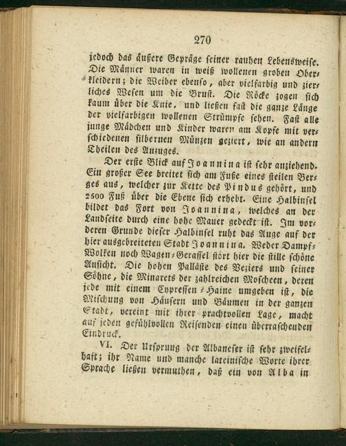 iedoch das Kußere Gepraͤge ſeiner rauhen Lebensweiſe. Die Maͤnner waren in weiß wollenen groben Ober⸗ „kleidern; die Weiber ebenſo, aber vielfarbig und zier⸗ liches Weſen um die Bruſt. Die Rocke zogen ſich kaum uͤber die Knie, und ließen faſt die ganze Laͤnge der vielfarbigen wollenen Strümpfe ſehen. Faſt alle junge Maͤdchen und Kinder waren am Kopfe mit ver⸗ ſchiedenen ſilbernen Muͤnzen geziert, wie an andern Dheilen des Anzuges. Der erſte Blick auf Foanning iſt ſehr anziehend. Ein großer See breitet ſich am Fuße eines ſteilen Ber⸗ ges aus, welcher zur Kette des Pindus gehoͤrt, und 2600 Fuß uͤber die Ebene ſich erhebt. Eine Halbinſel bildet das Fort von Foannina, welches an der Landſeite durch eine hohe Mauer gedeckt iſt. Im vor⸗ deren Grunde dieſer Halbinſel ruht das Auge auf der hier ausgebreiteten Stadt Jvannina. Weder Dampf⸗ Wolken noch Wagen⸗Geraſſel ſtört hier die ſtille ſchoͤne Anſicht. Die hohen Pallaͤſte des Veziers und ſeiner Soͤhne, die Minarets der zahlreichen Moſcheen, deren jede mit einem Cypreſſen„Haine umgeben iſt, die Miſchung von Haͤuſern und Baͤumen in der ganzen Stadt, vereint mit ihrer prachtvollen Lage, macht auf jeden gefuͤhlvollen Reiſenden einen uͤberraſchenden Eindruck.. VI. Der urſprung der Albaneſer iſt ſehr zweifel⸗ haft; ihr Name und manche lateiniſche Worte ihrer Sprache lieben vermuthen, daß ein von Alba in
