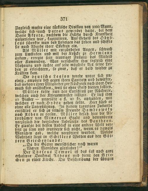 Muͤller faßte nun den Entſchluß zur Ruͤckretſe, welchen auch der Kriegsminiſter billigte. Er ließ ihm 20 FPiaſter— ungefaͤhr 6 fl. 40 kr. auszahlen, mit welchen er nach Hydra gehen ſollte. Hier blieb er ohne alle Unterſtuͤtzung. In dieſem traurigen Zuſtande eutſchioß er ſich zu ſeinem Freunde Dombrowsky nach Athen ju reiſen. Muͤller beſah hier die Al⸗ terthuͤmer von Minervas Stadt und bewunberte vorzüglich die herrlichen Vebetreſte des Pantheon. Er glaubte bei deſſen Anblick in eine andere Welt ver⸗ ſetzt ju ſeyn und wunderte ſich nicht, wenn es damals Menſchen gab, welche vergottert wurden. Welche Wahrheit liegt in Schillers Worten aus den Goͤt⸗