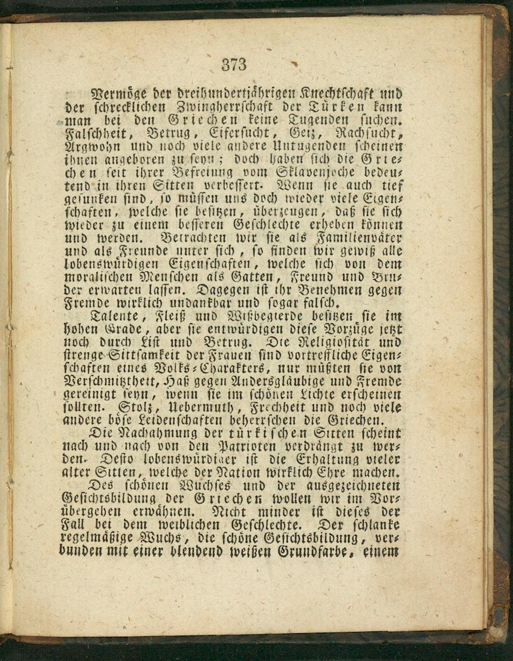Talente, Fleiß und Wißbegterde beſitzen ſie im hohen Crade, aber ſie entwuͤrdigen dieſe Vorzuͤge jetzt noch durch Ciſt und Betrug. Die Religioſttär und ſtrenge Sittſamkeit der Frauen ſind vortreffliche Eigen⸗ ſchaften eines Volks⸗Charakters, nur mäßten Le von Verſchmitztheit, Haß gegen Andersglaͤubige und Fremde gereinigt ſeyn, wenn ſie im ſchoͤnen Lichte erſcheinen ſollten. Stolz, Uebermuth, Frechheit und noch viele andere boͤſe Leidenſchaften beherrſchen die Griechen.