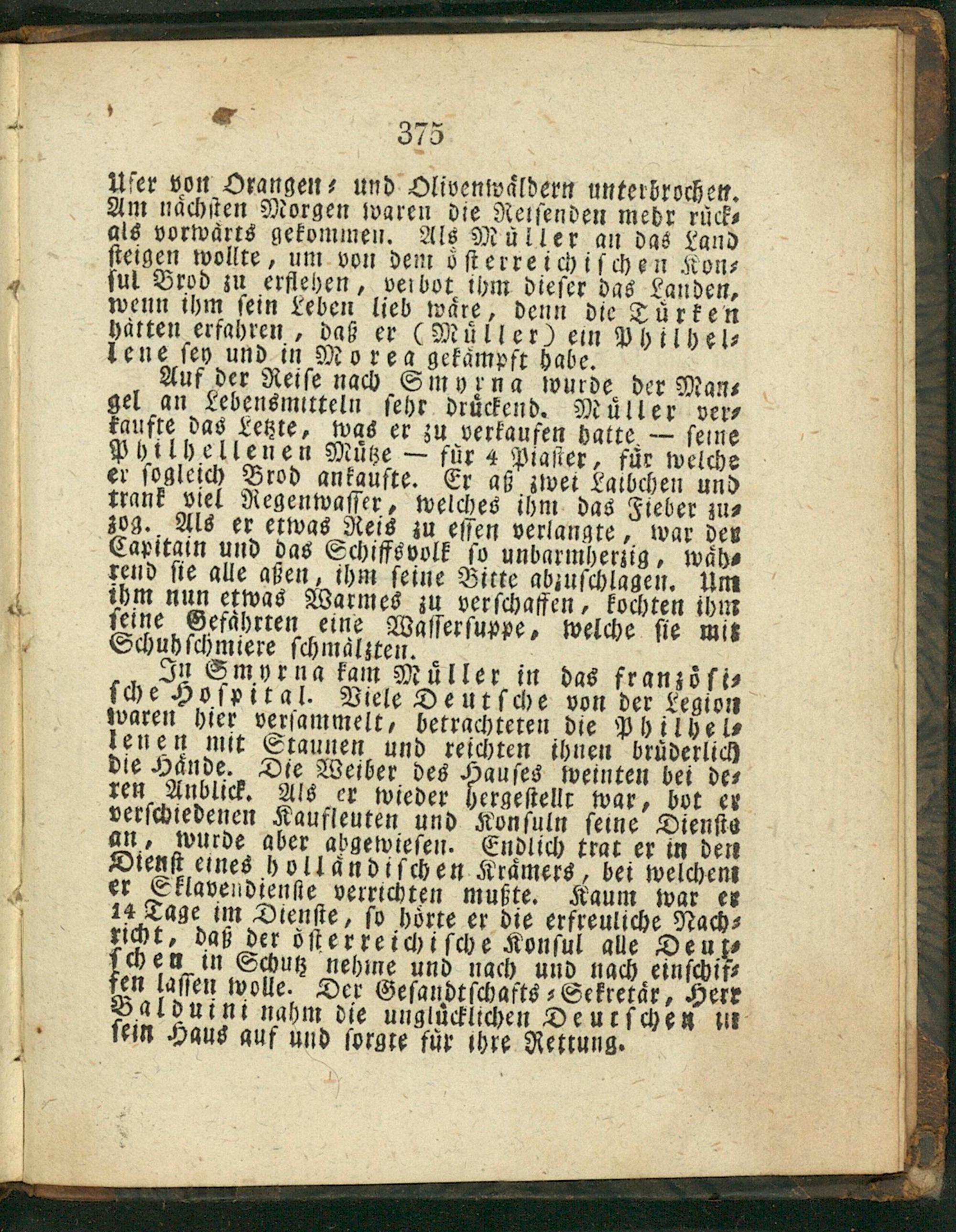 In Smyrna kam Muͤller in das franzoͤſi⸗ ſche Hyſpital. Viele Deutſche von der Legion waren hier verſammelt, betrachteten die Philhel⸗ lenen mit Staunen und reichten ihnen bruͤderlich die Haͤnde. Die Weiber des Hauſes weinten bei de⸗ ren Anblick. Als er wieder dergeſiellt war, bot er verſchiedenen Kaufleuten und Konſuln ſeine Dienſte au, wurde aber abgewieſen. Endlich trat er in den Dienſt eines holländiſchen Krämers, bei welchen er Sklavendienſe verrichten mußte. Kaum war er 1 ½ Tage im Dtenſte, ſo horte er die erfreuliche Nach⸗ richt, daß der öſterreichiſche Konſul alle Deu⸗ in in Schutz nehme und nach und nach einſchit⸗ en laſſen wolle. Der Gefandtſchafts⸗Sekretär, Herr Balduini nahm die unglücktichen Deurſchen in ſein Haus auf und lorgte für ihre Rettung.