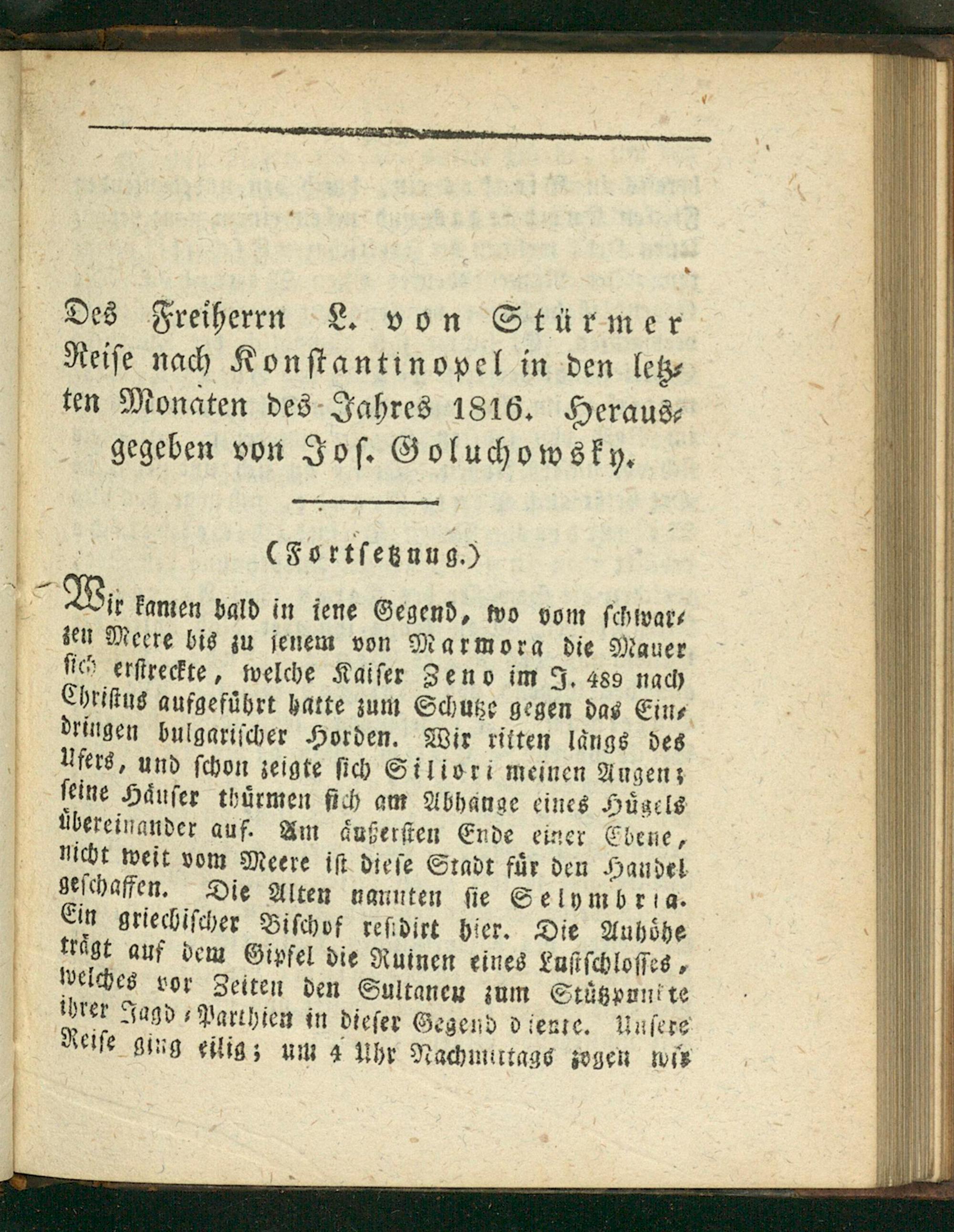 Des Freiherrn L. von Stürmer Reiſe nach Konſtantinopel in den letz⸗ ten Monaten des Jahres 1816. Heraus⸗ gegeben von Joſ. Goluchowsky.
