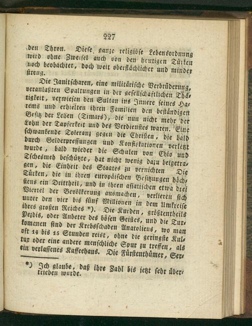 Die Janitſcharen, eine militariſche Verbrůderung, veranlaßten Spaltungen in der geſellſchaftlichen Thä⸗ tigkeit, verwieſen den Sultan ins Innere ſeines Ha⸗ rems und erhielten ihren Familien den beſtaͤndigen Beſitz der Lehen(Timars), die nun nicht mehr der Lohn der Tapferkeit und des Verdienſtes waren. Eine ſchwankende Toleranz gegen die Chriſten, die bald durch Gelderpreſſungen und Konfikationen verletzt wurde, bald wieder die Schulen von Chio und Tſchesmeh beſchuͤtzte, hat nicht wenig dazu beigetra⸗ Len, die Einheit des Staates zu vernichten Die Luͤrken, die in ihren europaͤiſchen Beſitzungen hoch⸗ ſtens ein Drittheil, und in ihren aſtatiſchen etwa dret Viertel der Bevoͤlkerung ausmachen, verlieren ſich unter den vier bis fünf Millionen in dem Umkreiſe ibres großen Reiches*). Die Kurden, großtentheils Yeidis, oder Anbeter des boͤſen Geiſes, und die Tur⸗ komanen ſind der Krebsſchaden Anatoliens, wo man oft 14 bis 23 Stunden reist, ohne die geringſte Kul⸗