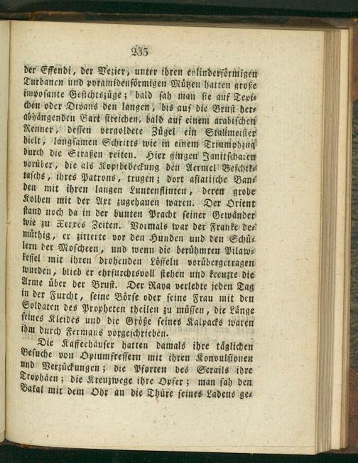 235 der Effendi, der Vezier, unter ihren eslinderformigen Turbanen und pytamidenfoͤrmigen Muͤtzen hatten große iwpoſante Geſichtszuͤge; bald ſah man ſie auf Tepi⸗ cben oder Divans den langen, bis auf die Bruſt her⸗ abdaͤngenden Bart ſtreichen, bald auf einem arabiſchen Renner, deſſen vergoldete Zuͤgel ein Stulmeiſter hielt, langſamen Schritts wie in einem Triumphzug durch die Straßen reiten. Hier gingen Janitſcharen voruͤber, die als Kopfbedeckung den Aermel Beſchik⸗ taſchs, ihres Patrons, trugen; dort aſiatiſche Ban⸗ den mit ihren langen Luntenflinten, deren grobe Kolben mit der Axt zugehauen waren. Der Drient ſand noch da in der bunten Pracht ſeiner Gewaͤnder wie zu erxes Zeiten. Vormals war der Franke de⸗ muͤthig, er zitterte vor den Hunden und den Schuͤ⸗ lern der Moſcheen, und wenn die berühmten Mlaw⸗ keſel mit ihren drohenden Loͤffeln voruͤbergetragen wurden, blieb er ehrfurchtsvoll ſtehen und kreuzte die Arme üͤber der Bruſt. Der Rava verlebte jeden Tag in der Furcht, ſeine Boͤrſe oder ſeine Frau mit den Soldaten des Propheten theilen zu mäſſen, die Länge ſeines Kleides und die Größe ſeines Kalpacks waren ihm durch Fermans vorgeſchrieben.. Die Kaffeehaͤuſer hatten damals ihre täglichen Beſuche von Dpiumfreſſern mit ihren Konvulſionen und PVerzuͤckungen; die Pforten des Serails ihre Lrophäenz die Kreuzwege ihre Dpferz man ſah den Bakal mit dem Dhr an die Thuͤre ſeines Ladens ge⸗