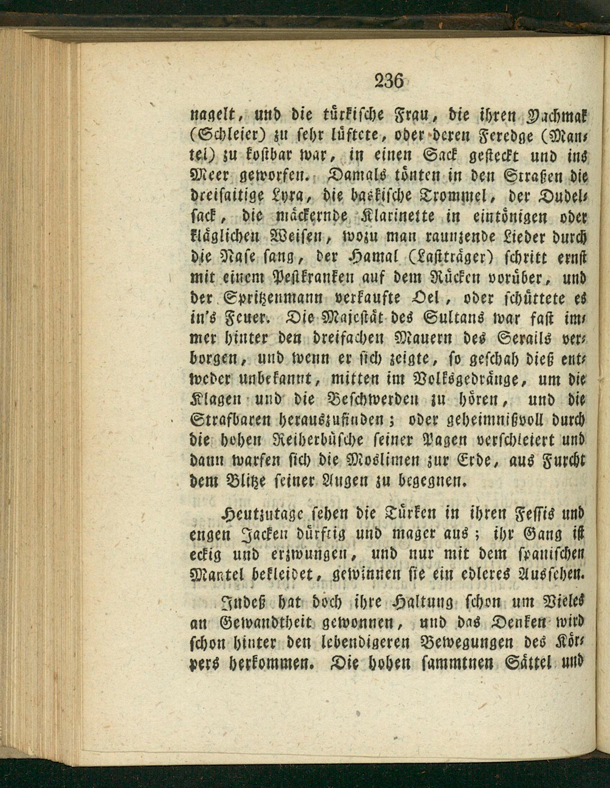 nagelt, und die tuͤrkiſche Frau, die ihren Yachmak (Schleier) zu ſehr luftete, oder deren Feredge(Man⸗ tei) zu koſtbar war, in einen Sack geſteckt und ins Meer geworfen. Damals toͤnten in den Straßen die dreiſaitige Lyra, die baskiſche Trommel, der Dudel⸗ ſack, die maͤckernde Klarinette in eintoͤnigen oder klaͤglichen Weiſen, wozu man raunzende Lieder durch die Naſe ſang, der Hamal(Laſttraͤger) ſchritt ernſt mit einem Peſtkranken auf dem Ruͤcken voruͤber, und der Spritzenmann verkaufte Del, oder ſchuͤttete es in's Feuer. Die Majeſtaͤt des Sultans war faſt im⸗ mer hinter den dreifachen Mauern des Serails ver⸗ borgen, und wenn er ſich zeigte, ſo geſchah dieß ent⸗ weder unbekannt, mitten im Volksgedraͤnge, um die Klagen und die Beſchwerden zu hoͤren, und die Strafbaren herauszufinden; oder geheimnißvoll durch die hohen Reiherbuͤſche ſeiner Pagen verſchleiert und daun warfen ſich die Moslimen zur Erde, aus Furcht dem Blitze ſeiner Angen zu begegnen.