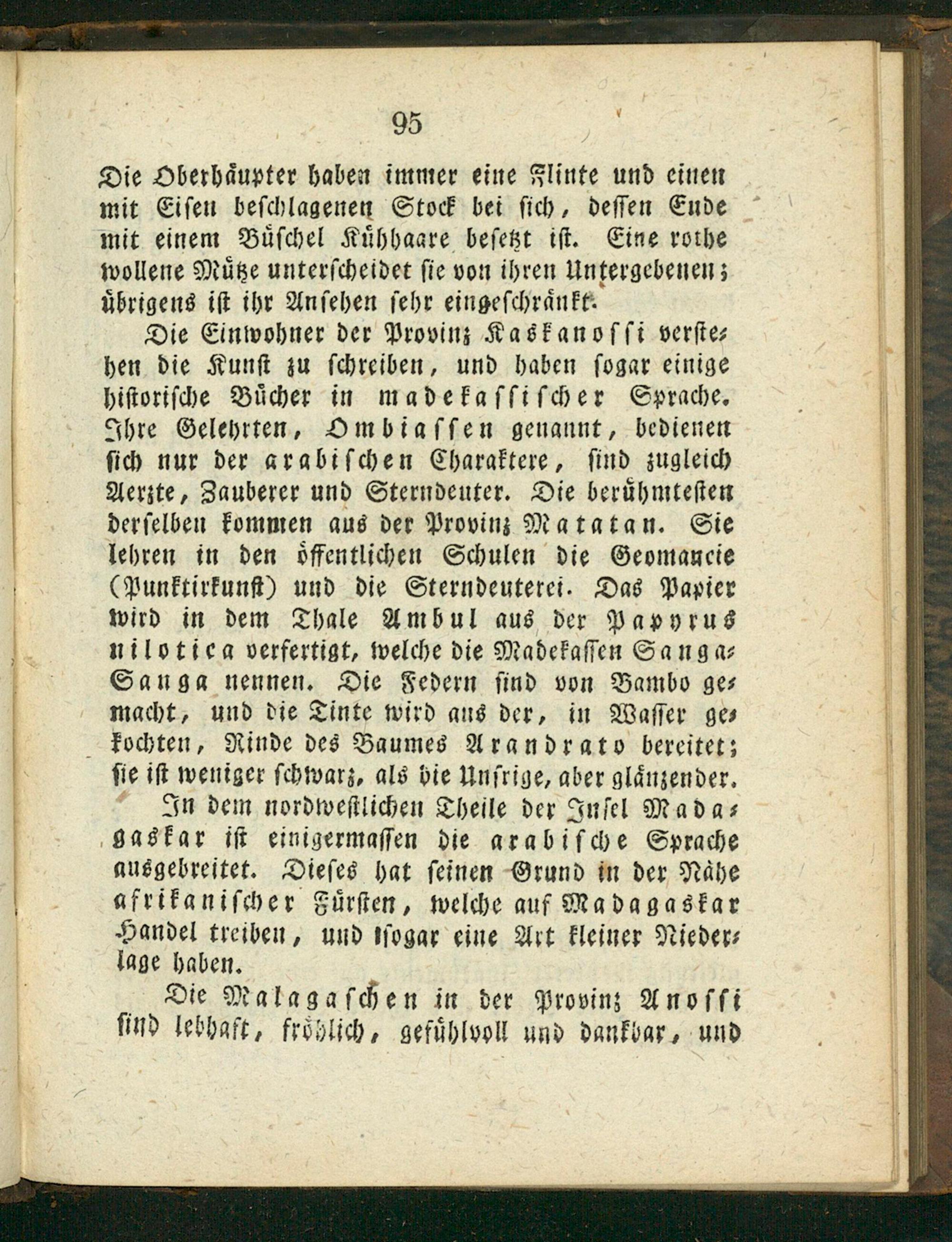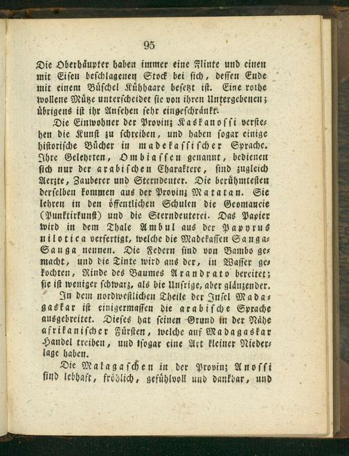 Die Einwohner der Provinz Kaskanoſſi verſte⸗ hen die Kunſt zu ſchreiben, und haben ſogar einige hiſtoriſche Buͤcher in madekaſſiſcher Sprache. Ihre Gelehrten, Ombiaſſen genannt, bedienen ſich nur der arabiſchen Charaktere, ſind zugleich Aerzte, Zauberer und Sterndeuter. Die beruͤhmteſten derſelben kommen aus der Provinz Matatan. Sie lehren in den oͤffentlichen Schulen die Geomancie (Punktirkunſt) und die Sterndeuterei. Das Papier wird in dem Thale Ambul aus der Papyrus nilotiea verfertigt, welche die Madekaſſen Sanga⸗ Sanga nennen. Die Federn ſind von Bambo ge⸗ macht, und die Tinte wird aus der, in Waſſer ge⸗ kochten, Rinde des Baumes Arandrato bereitet;