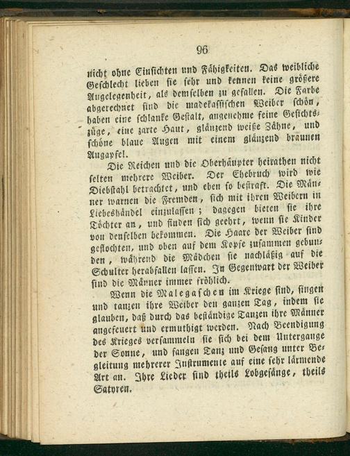 Wenn die Malegaſchen im Kriege ſind, ſingen und tanzen ihre Weiber den ganzen Tag, indem ſie glauben, daß durch das beſtaͤndige Tanien ihre Maͤnner angefeuert und ermuthigt werden. Nach Beendigung des Krieges verſammeln ſie ſich bei dem Untergange der Sonne, und fangen Tanz und Geſang unter Be⸗ gleitung mehrerer Inſtrumenle auf eine ſehr laͤrmende Art an. Ihre Lieder ſind theils Lobgeſaͤnge, theils Satyren.