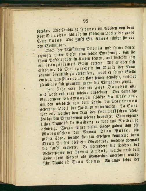 betragt. Die Landſpitze Itaper im Norden von dem Fort Dauphin ſchließt im ſudlichen Theile die große Bay Lukar. Die Inſel St. Klara jchuͤtzt ſie vor den Seewinden⸗ Doch der Muͤſſiggang Pronis und ſeiner Leute erzeugte unter dieſen eine ſolche Empoͤrung, daß ſie ihren Befehlshaber in Ketten legten, aus welchen ibhn ein franzoͤſiſches Schiff rettete. Als er aber ſich erfrechte, die Malegaſchen im Dienſte der Kom⸗ vagnie oͤffentlich zu verkaufen, ward er ſeiner Stelle entſetzt, und Flaceourt ſtatt ſeiner gewaͤhlt, welcher gleichfals ſich grauſam gegen die Einwohner zeiste. Im Jahr 4665 brannte Fort Dauphin ab, und ward erſt 1663 wieder aufgebaut. Der damalige Gouverneur Chamangon ſchickte La Caſe aus⸗ um den noͤrdlich von dem Lande der Matatanen gelegenen Theil der Inſel zu unterſuchen. La Caſe war es, welcher den Ruf des franzoͤſiſchen Vol⸗ kes bei den Eingebornen wieder herſtellte. Sein eigent⸗ Ucher Name iſt Le Vacher; er war aus Rochelle gebuͤrtig. Wegen ſeiner vielen Siege gaben ihm die Malegaſchen den Namen Dian Puſſe, die groͤßte Ehre, welche ſie ihm erzeigen konnten: denn Dian Puſſe hiet ein Oberhaupt⸗ welches ehemals die Inſel eroberte. Er heirathete die Tochter des Beherrſchers der Provinz Ambul, welche nach dem Tode ihres Vaters als Monarchin anerkant wurde⸗ Ihr Name iſt Dian Nong. Anfangs lebte der