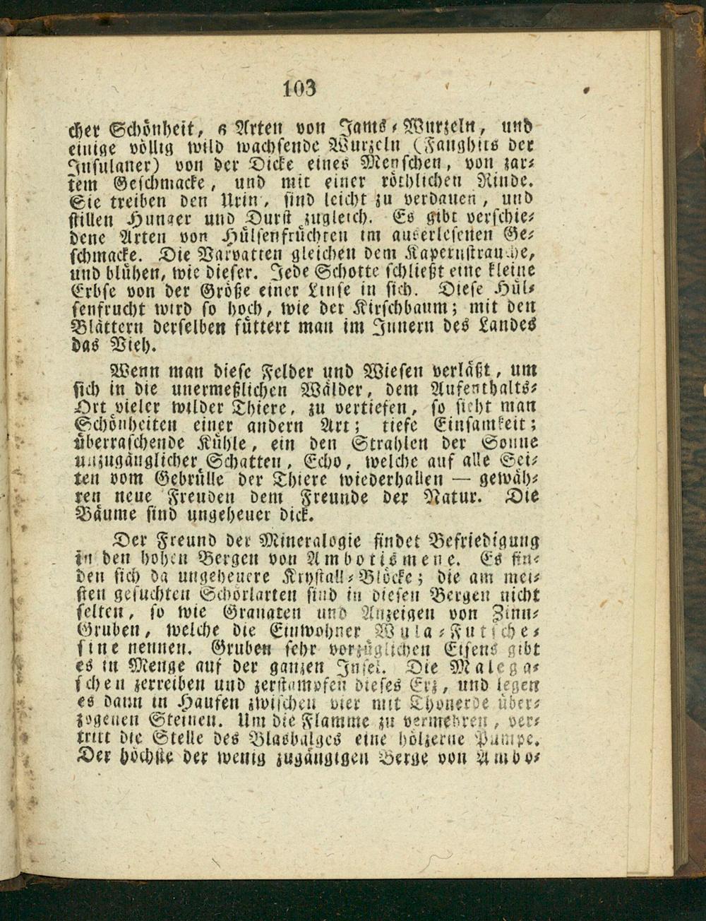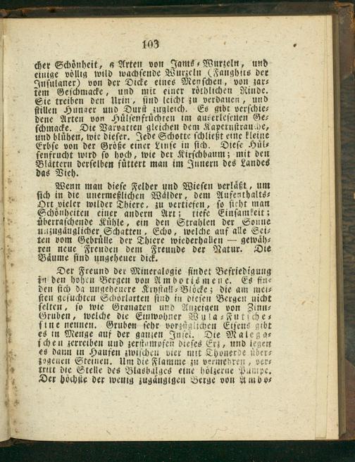 Der Freund der Minerglogie findet Befriedigung in den hohen Bergen von Ambotismene. Es fin⸗ den ſich da ungeheuere Kryſtall⸗Bloͤcke; die am mei⸗ ſten geſuchten Schbrlarten ſind in dieſen Bergen nicht ſelten, ſo wie Granaten und Anzeigen von Zinn⸗ Gruben, welche die Einwohner Wula⸗Futſche⸗ ſine nennen. Gruben ſehr vorzäglichen Eiſens gibt es in Menge auf der ganzen Inſet. Die Malega⸗ ſchen zerreiben und zerſtampfeñ dieſes Erz, und legen es dann in Haufen zwiſcheu vier mit Shonerde über⸗ zogenen Steinen. Um die Flamme zu vermehren, ver⸗ tritt die Stelle des Blasbalges eine holzerne Pumpe. Der hoͤchte der wenig zugaͤngigen Berge von Amnbo⸗